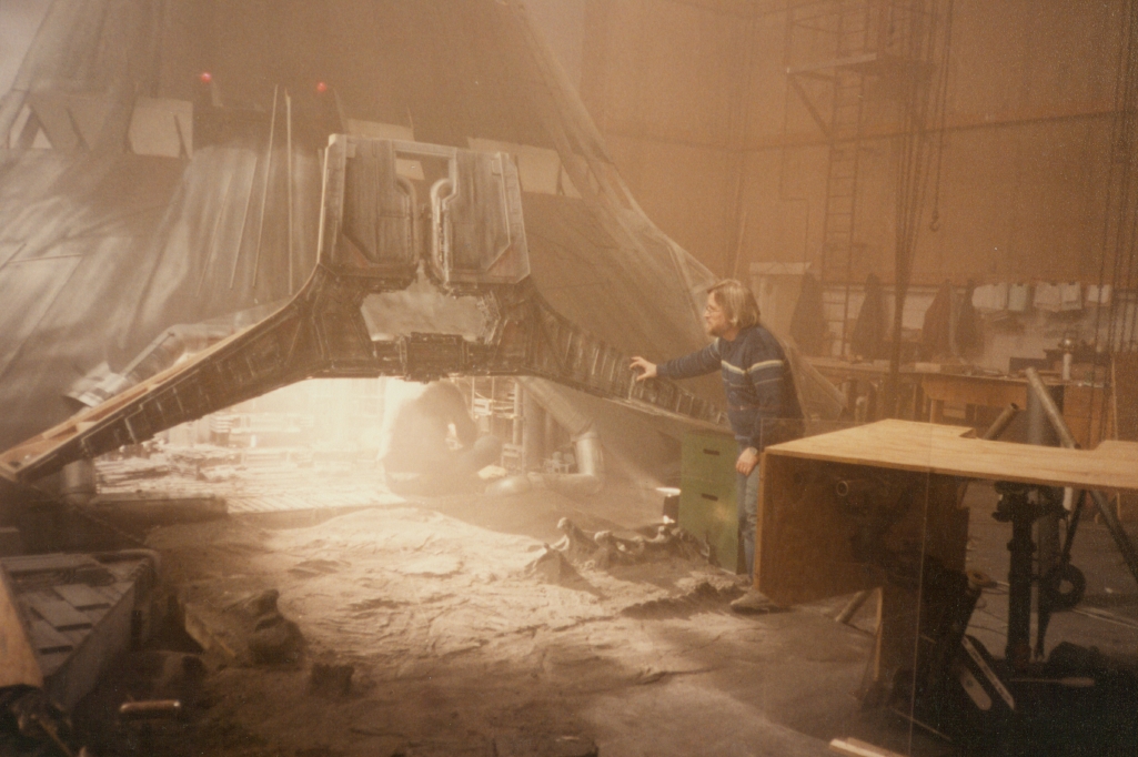 *Dune 1984, David Lynch. Model effects by academy award winner Carlos Rambaldi. The Lighter on the airfield was part of an extreme forced perspective shot used to composite live actors with the models. Effects still hold up 35 years later in HD (if you have it on DVD or stream it).