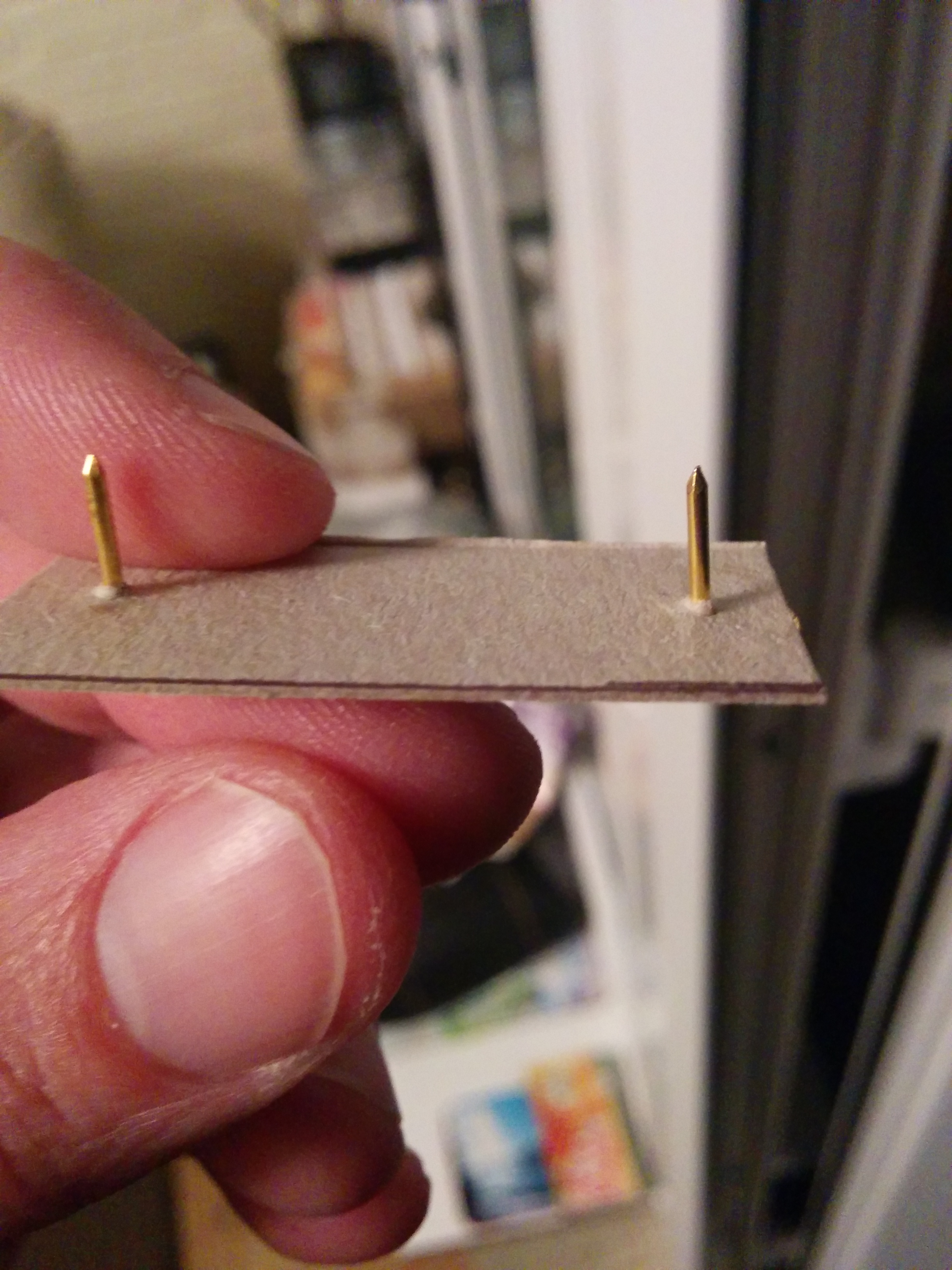 The wire is just garden wire first twisted on itself to give it a bit of texture, and then wrapped around one of the (many) match sticks I have lying around to give it a coiled look. in the blog that was then stuck onto a base, but I decided to try and make some posts for it. after a bit of thought I settled on drawing pins pushed through card board strips... I believe it will work, it just means I can NEVER drop them on the floor and forget about it!