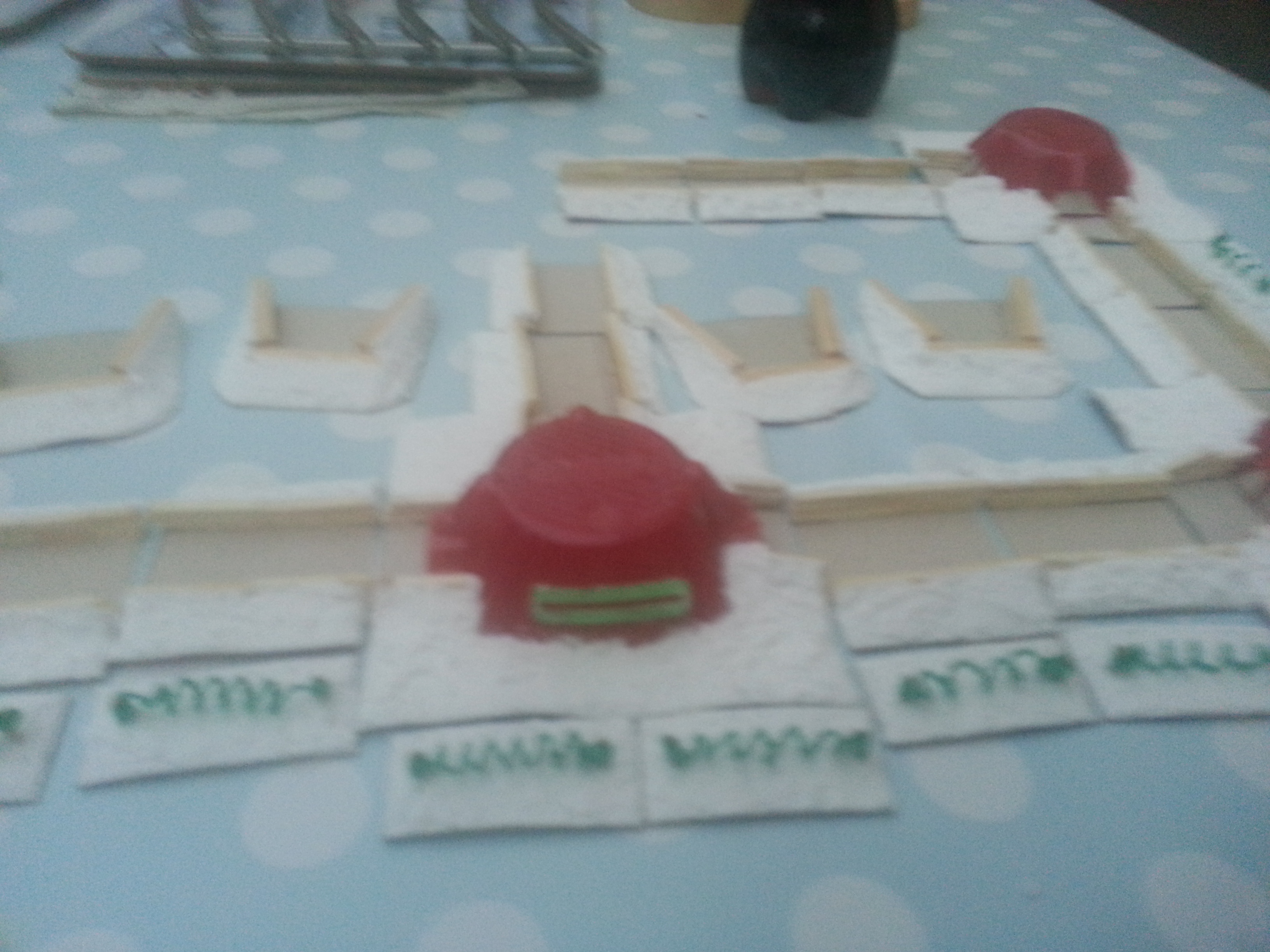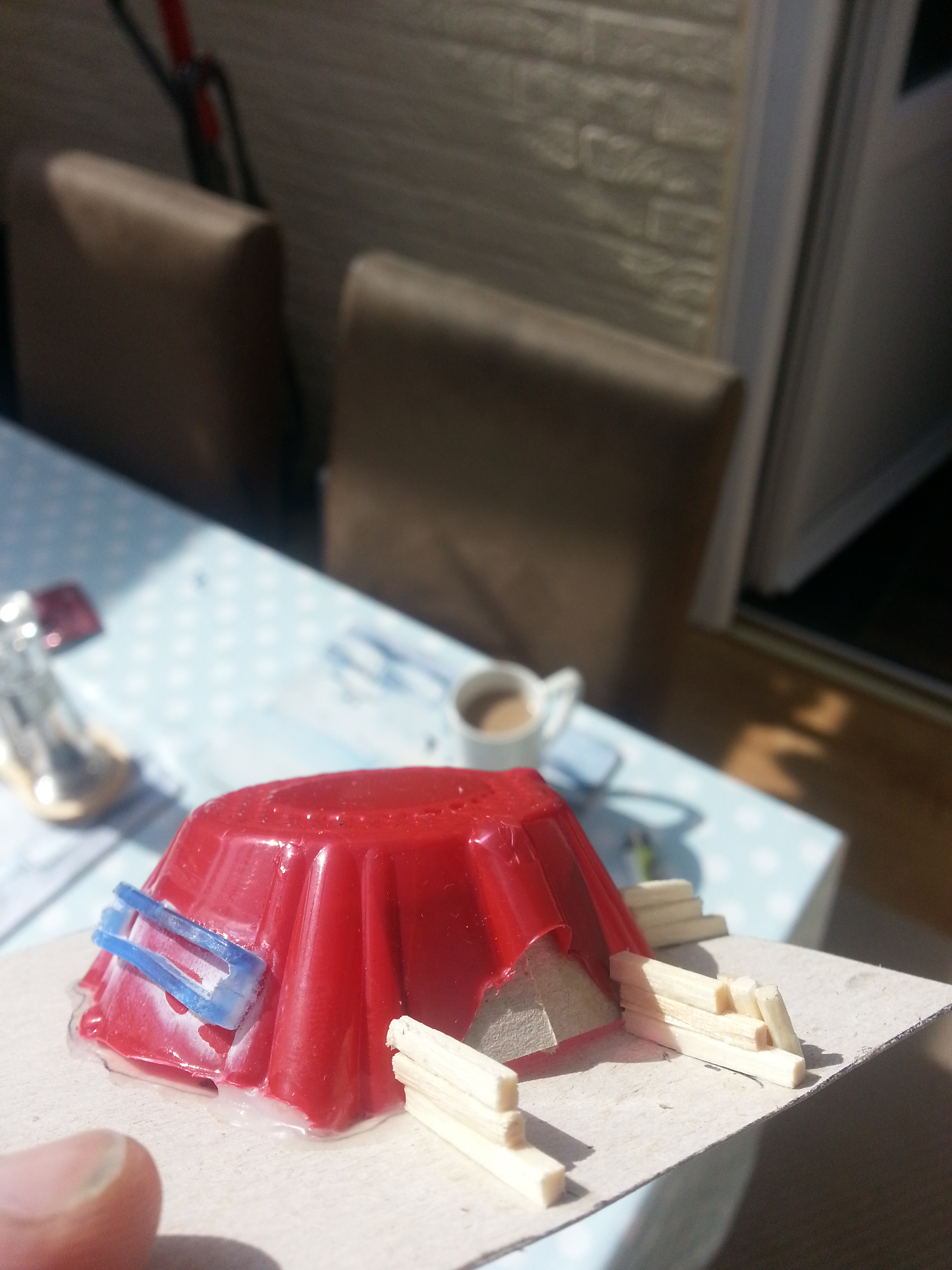 I was having some problems deciding on how to make the bunkers. my bits box was sorely depleted (I moved to the area about three years ago, and although I brought my completed models I left all my bits behind... sorely regretting that now!) and I didn't trust my crafting skills to try and sculpt them. looking at the rules I saw that I didn't have to make a sprawling base (although I want to make one for my trenchers eventually as I am viewing them as PDF troops, where as the Steel legion are brought in off planet when the it all goes to Xenos / heretical shaped) but only something big enough for three bases to reasonably fit in. I struck upon the idea of using the 'cup' parts from a Mr Kiplings cake boxed set as the bunkers.
