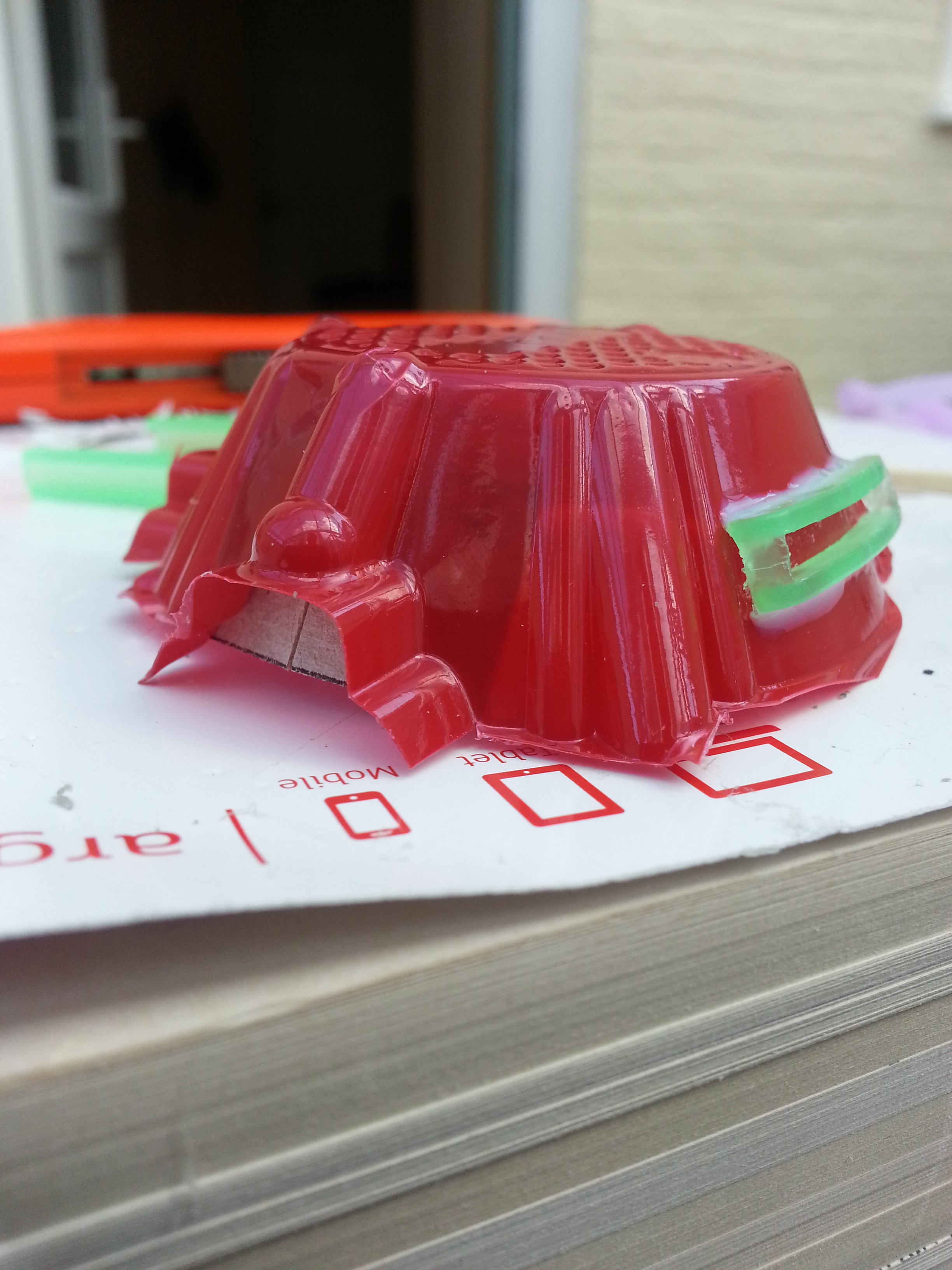 I had the shape, but a bunker isn't a bunker unless the troops inside can fire out. My helpful other half helped me out with this. She knew that I have been hording junk for this project and had given me a load of really cheap key rings, after a bit of cutting (see below, the horrendous green thing) I used the end of it and simply glued it to the edge. I had just enough to complete 6 of the bunkers. I am slightly concerned about how i am going to paint them, but I figure paint the hole black and maybe stick some off cuts of plastic as gun barrels sticking out and it should be ok... from a distance...