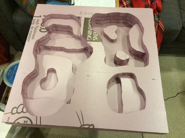 After cutting up some 1" pink foam boards, I started cutting out shapes according to the sketches. This is the first section I have and I think it looks pretty good.