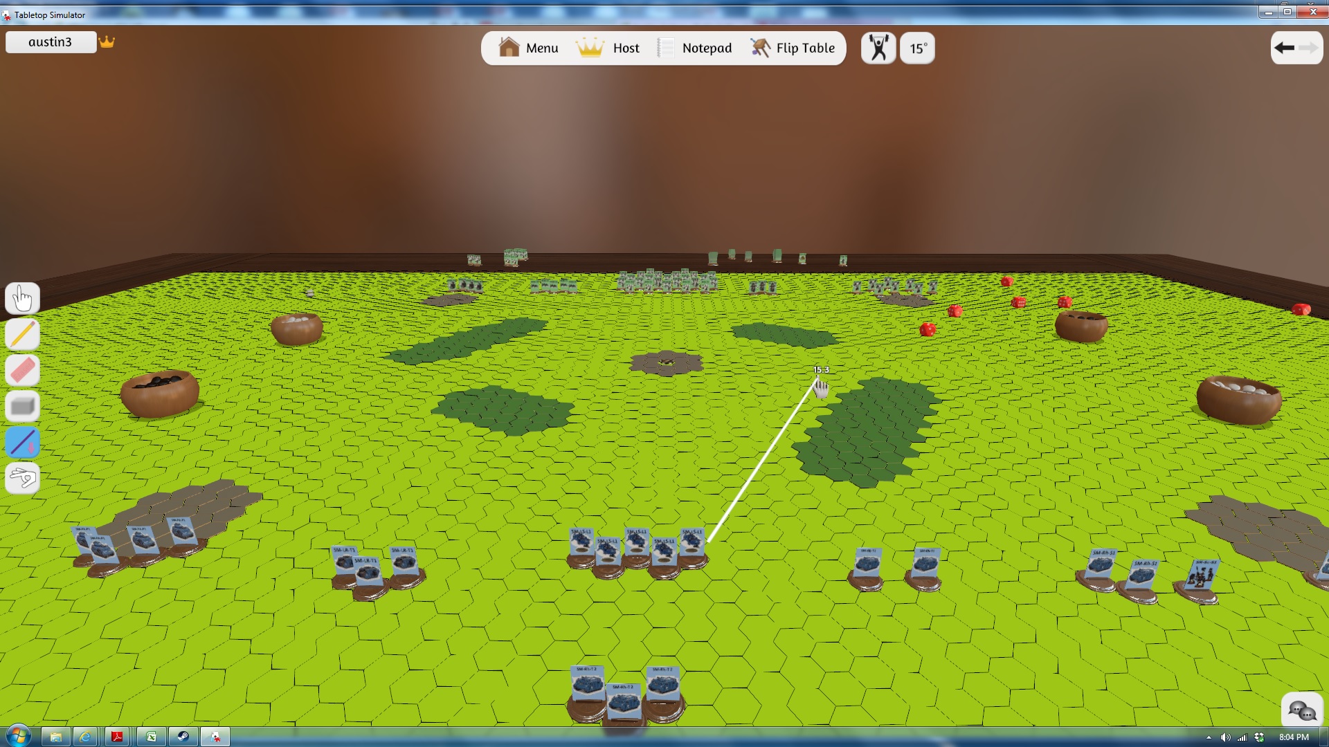 I had been considering using zombocom's simulator, but it looked like there were some issues and enthusiasm was waning. I haven't tried zombocom's program, so maybe the people who tried it can give me some feedback about how hard it is make armies and maps and use the software. In Tabletop Simulator, it takes about 1 hour to get the models for an army uploaded, about 45 minutes to construct a large map, and about 45 minutes to assemble armies and do miscellaneous setup. The models and map (or the whole setup) can then be reused. The graphics could actually be much nicer than what is in the screenshot; the screenshot just shows a low quality map I threw together and the default models for units. In any case, I would be interested in an update on zombocom's program and if he plans to continue developing it.