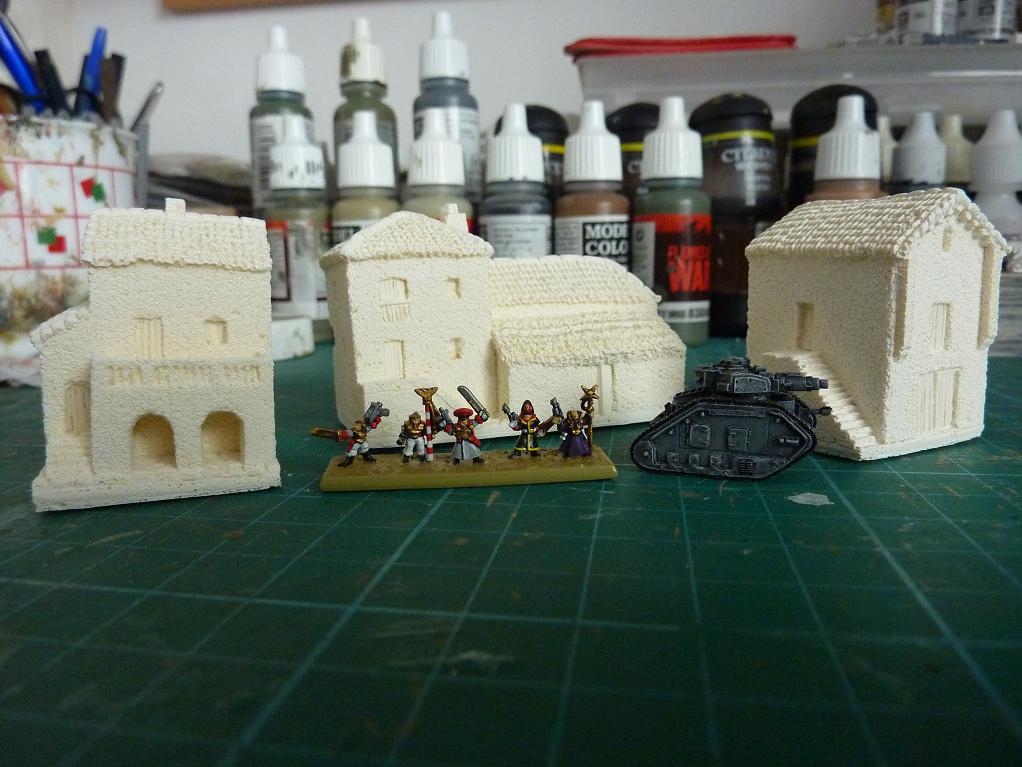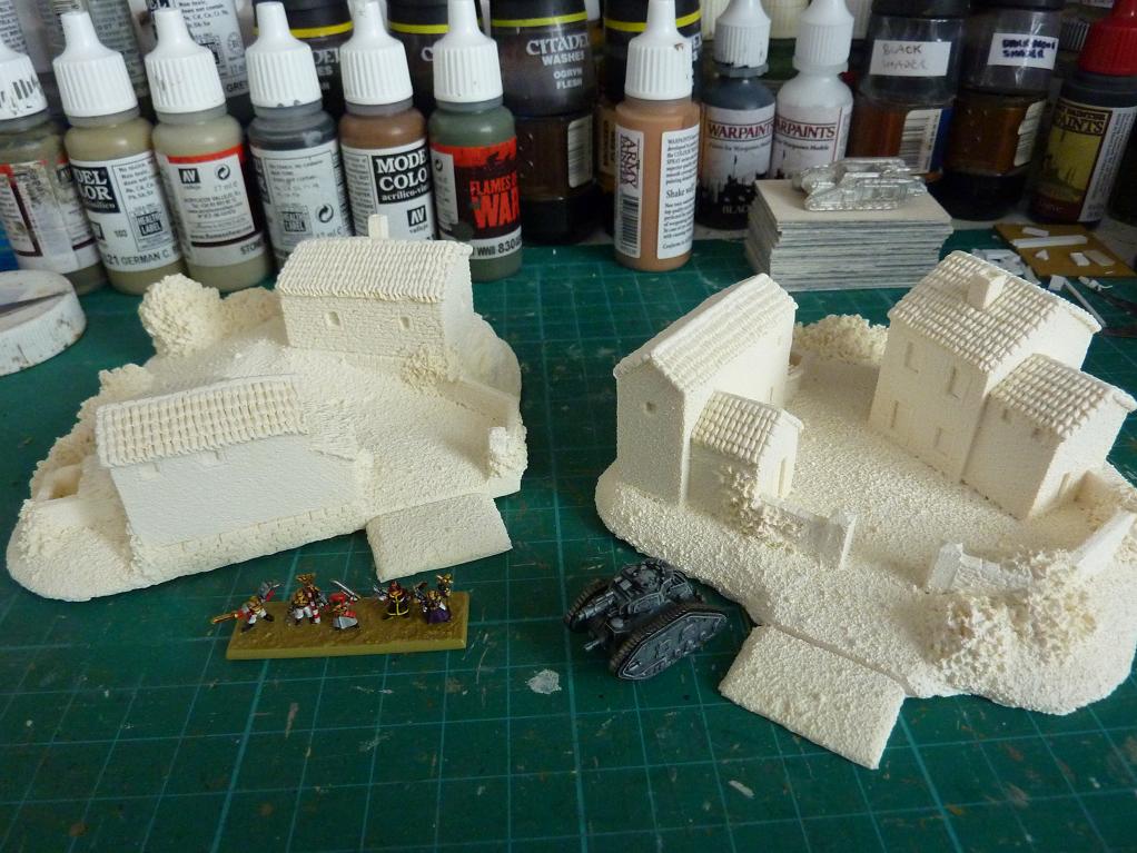 OK these are from the 6mm spanish range, first two free standing farm pieces, second a few buildings from the hill town set. All undercoated white for now.
