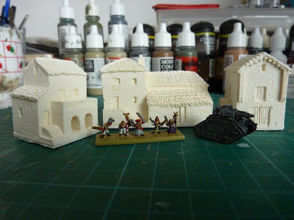 OK these are from the 6mm spanish range, first two free standing farm pieces, second a few buildings from the hill town set. All undercoated white for now.