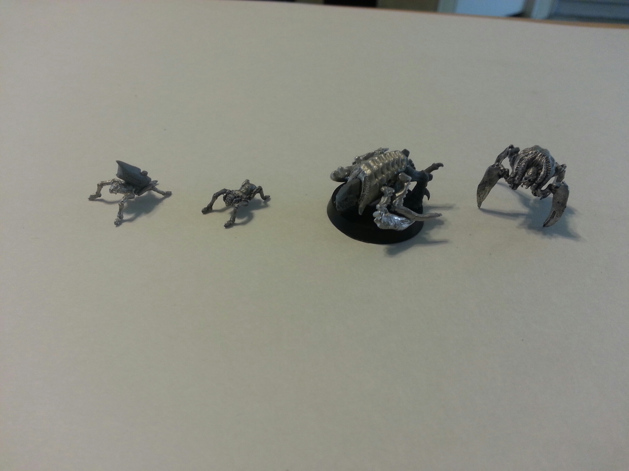 http://www.rebelminis.com/scbuandcr.htmlThey carry more types in other lines that I didn't get because they didn't fit the look/type I was after. Just quick cleaned the big bugs and black inked all for detail look. Hope my phone camera isn't too bad, lighting may be off because of East Tennessee weather screwing with me. Hope I upload these correct. From left to right are Spider bug, Gargant, Space Scorpion, Eldar Wraithlord, Terror-mite, Rhino (SM2 set), Death Strider, Space Marine (E40K). Space Marine is on a 15mm round base, unpainted gargant (getting there....) is on a 60mm round base, the overhead has a 20mm square and 25mm round base. Good possible nid uses. the space scorpion is 4 parts with the head mounted on a nub like 40K gaunt model, 2 leg sides, and body. Spider bug is 8 parts, 6 of which are legs, thorax/abdomen part, and head. Legs are mounted under the carapace on ball mounts so changing with bits shouldn't be to hard. The head is also a ball socket type of mount. Terror mites are 2 parts with body and leg parts seperate. Death strider is one piece. All are metal, some clean up but not to bad, seen much worse. Customer service from Rebel Minis is amazing. Great communication. Asked about the 6mm line as well during my order, he told me they had issues with the prints and needed them reprinted. They are coming but he isn't exactly sure of the timing yet. Has several other projects ahead. Anyone wants a different angle or any questions let me know. Also added my work in progress on conversion to Tervigon and Biovore from these. Still need green stuff work but just wanted to show some possible uses. Tervi is Terror Mite with ripper and stealer, not to happy with it because the gaunt sac isn't really visible. Biovore is cut down flesh boarer mounted, not sure about that..... loaded pics of comparison backwords.. will fix that next time.