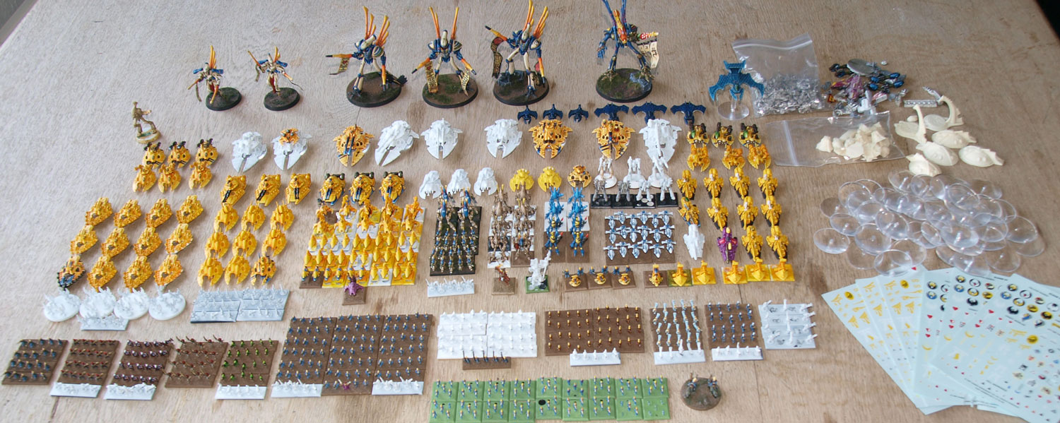 I've decided that it is time for another clearance sale. I just have way more stuff that I am ever realistically going to use. So: Another army's gotta go! Although I do like the Eldar aesthetically, it has never been an army I actually enjoyed painting, so it has been sitting around in boxes for way too many years now.