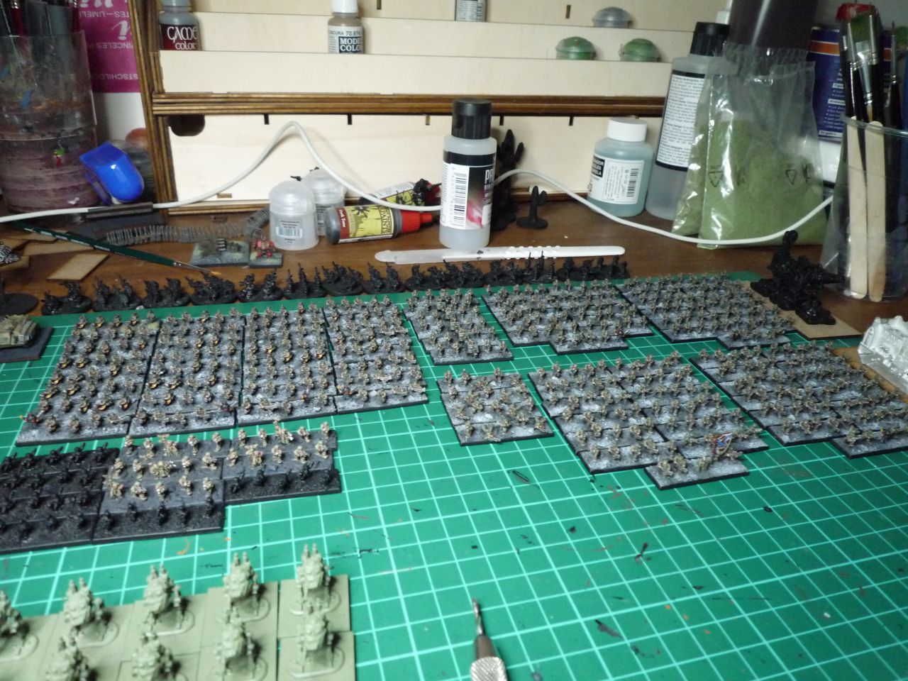 I've been busy painting tons of cadian themed INF stands for my IG army. the bulk of the army is made up of DRM pax arcadian minis. currently there are 6 normal coys, 6 stormtrooper coys, 1 coy of ogryns, 8 snipers, 6 fire support stands, 5 psykers, 8 mole launchers and a piles of commisar stands.