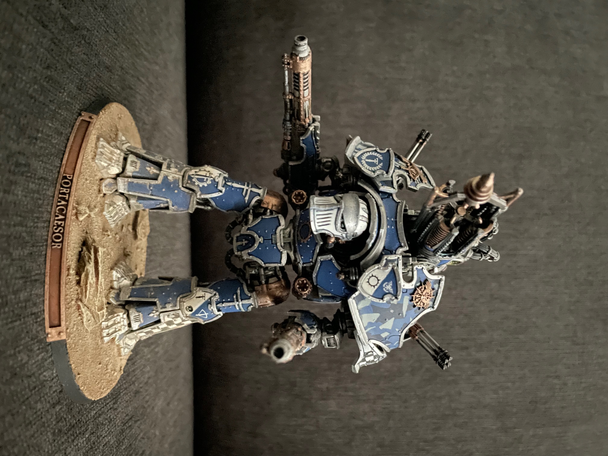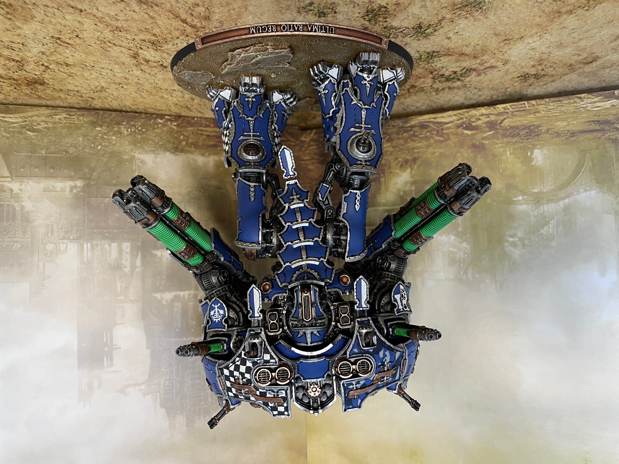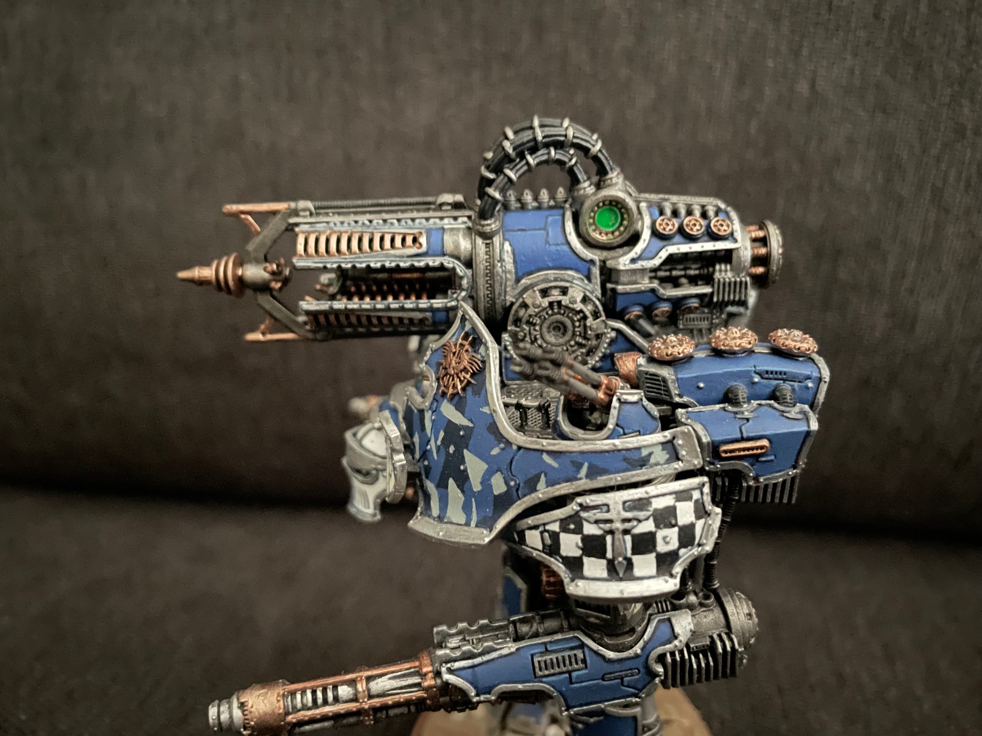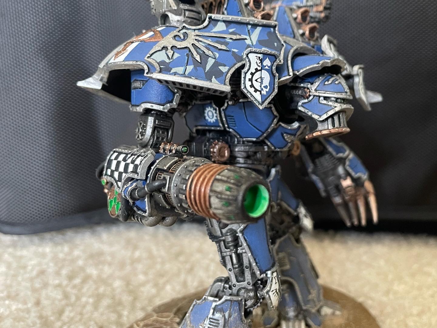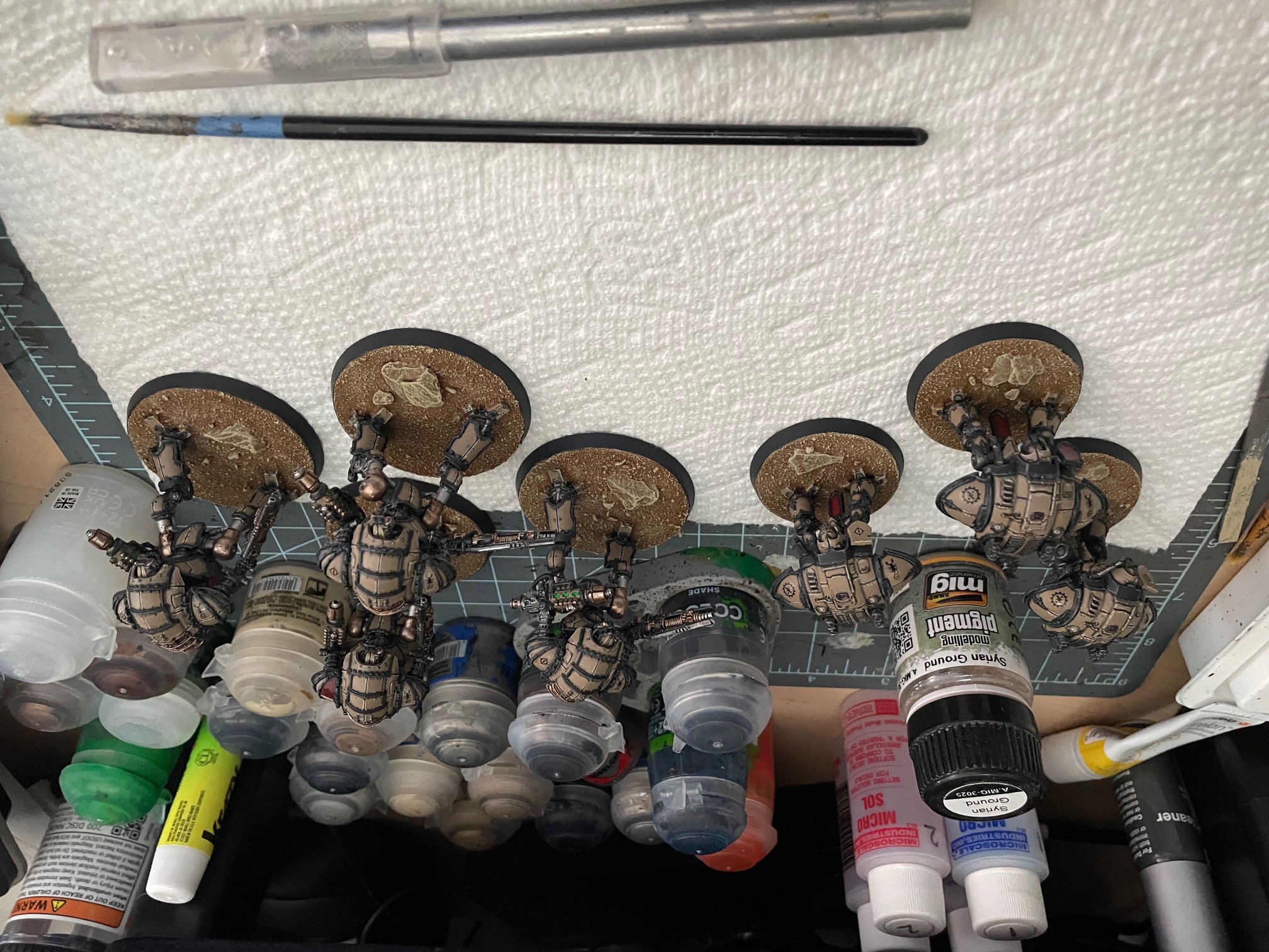 I finished up another seven knights for AT/LI, three more Questoris chassis and a quartet of Cerastus Atropos. Haven't been able to set up a fancy backdrop for photography, so here's everybody on my painting table: