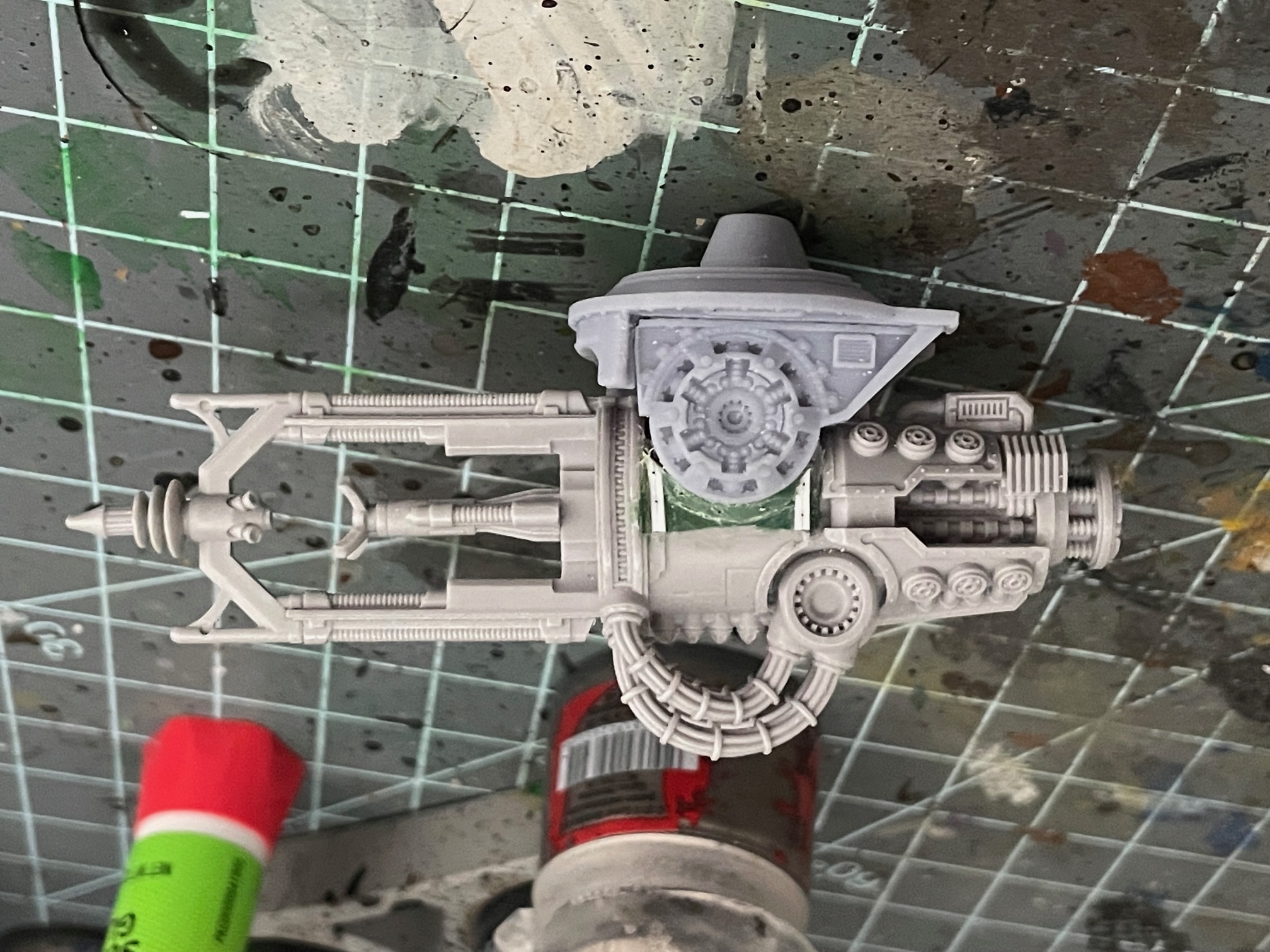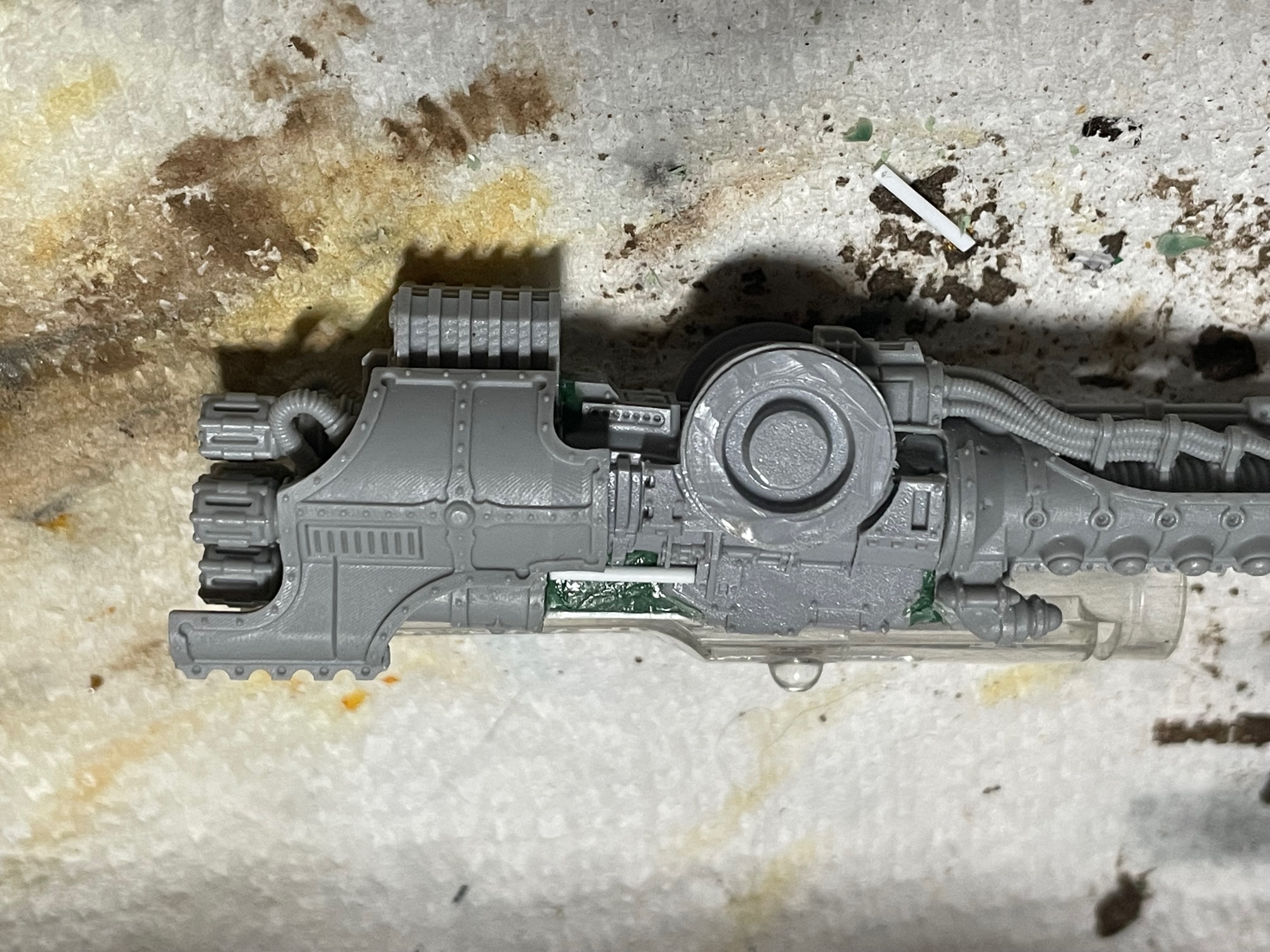 Finally, my current project is (still) converting a Warlord conversion beamer to fit on a Warbringer carapace mount. Finished cutting out portions of the old weapon, fitting the mounting point, backfilling everything I'd cut out around the mount, and building the trim back up with styrene & greenstuff. Once the trim greenstuff cures, it's all going to get a light sand & a filler layer of liquid greenstuff to smooth things out, and then I get to experiment with N-scale resin rivet decals!