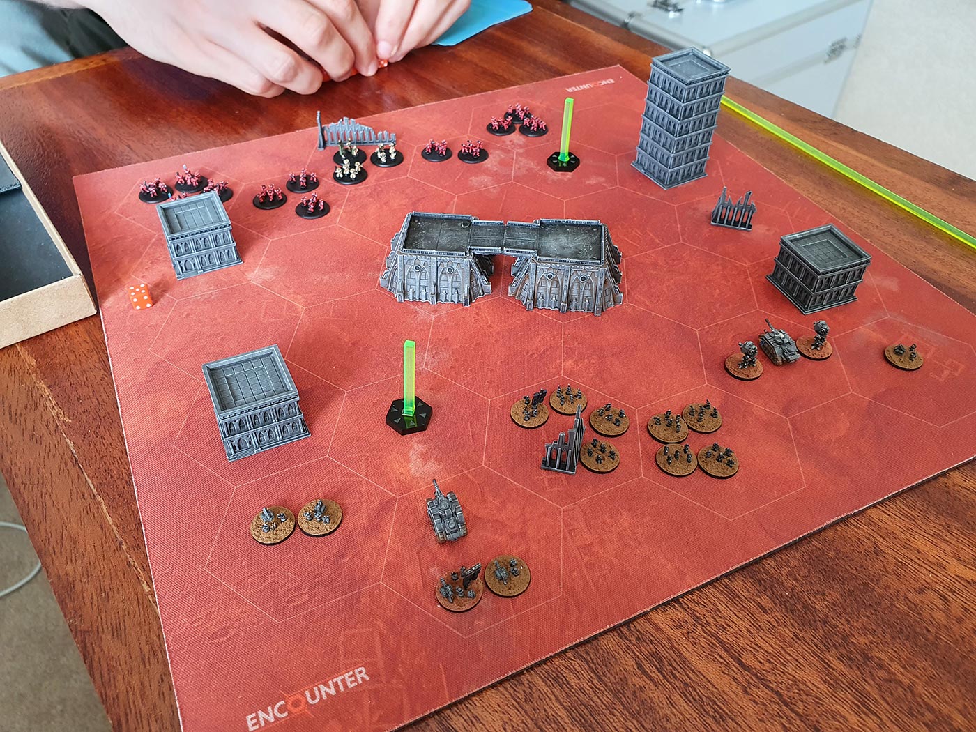 Thought I'd post a quick battle report of a game Apoc and I played. The game is called Encounter - a hex based system designed for skirmish games up to full scale battles. This was a skirmish game. The model scale is intended to be 6mm, but being hex, the scale is easily changed. We're using 3mm (travel scale) for this game.
