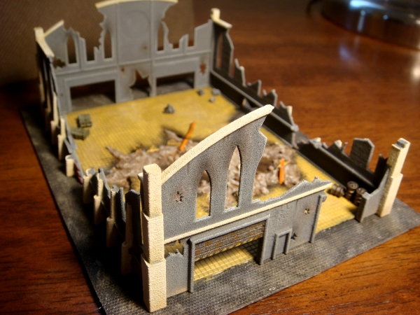 -mixture of sandy paste, kitty litter, and some chopped up sprue slapped onto the edges where the walls meet the ground\floor