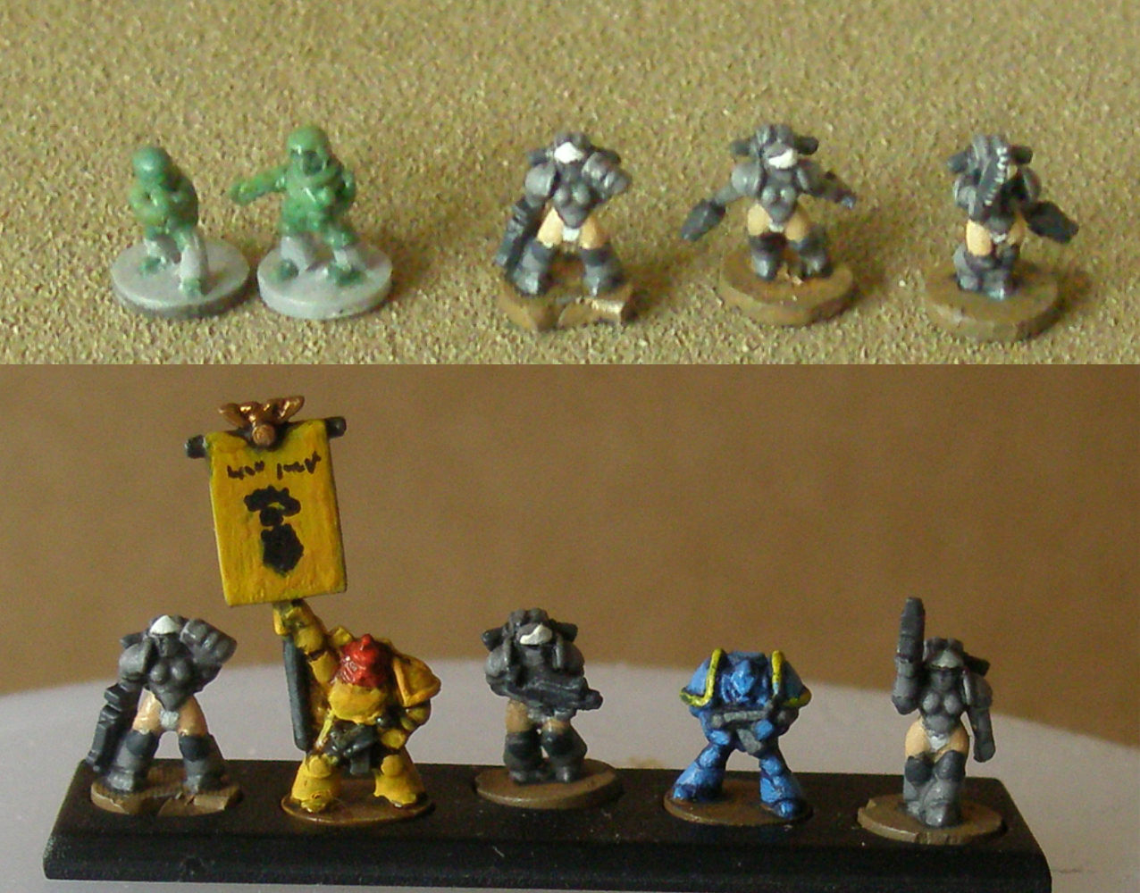 I have a point and shoot superzoom camera with image stabilization, so tripod or books don't seem needed. If I leave the camera on "intelligent Assistant", the camera seems to switch to macro mode. I'm going to try playing with the background color, the exposure (making the image brighter), and use Aperture-priority mode (to change the f-stop, I think, to make the depth of focus shorter, so it focuses even more on the minis and less on the background) this weekend. The f-stop should make the image brighter too, so the camera is looking at the brightness and colors for the minis and not the background.