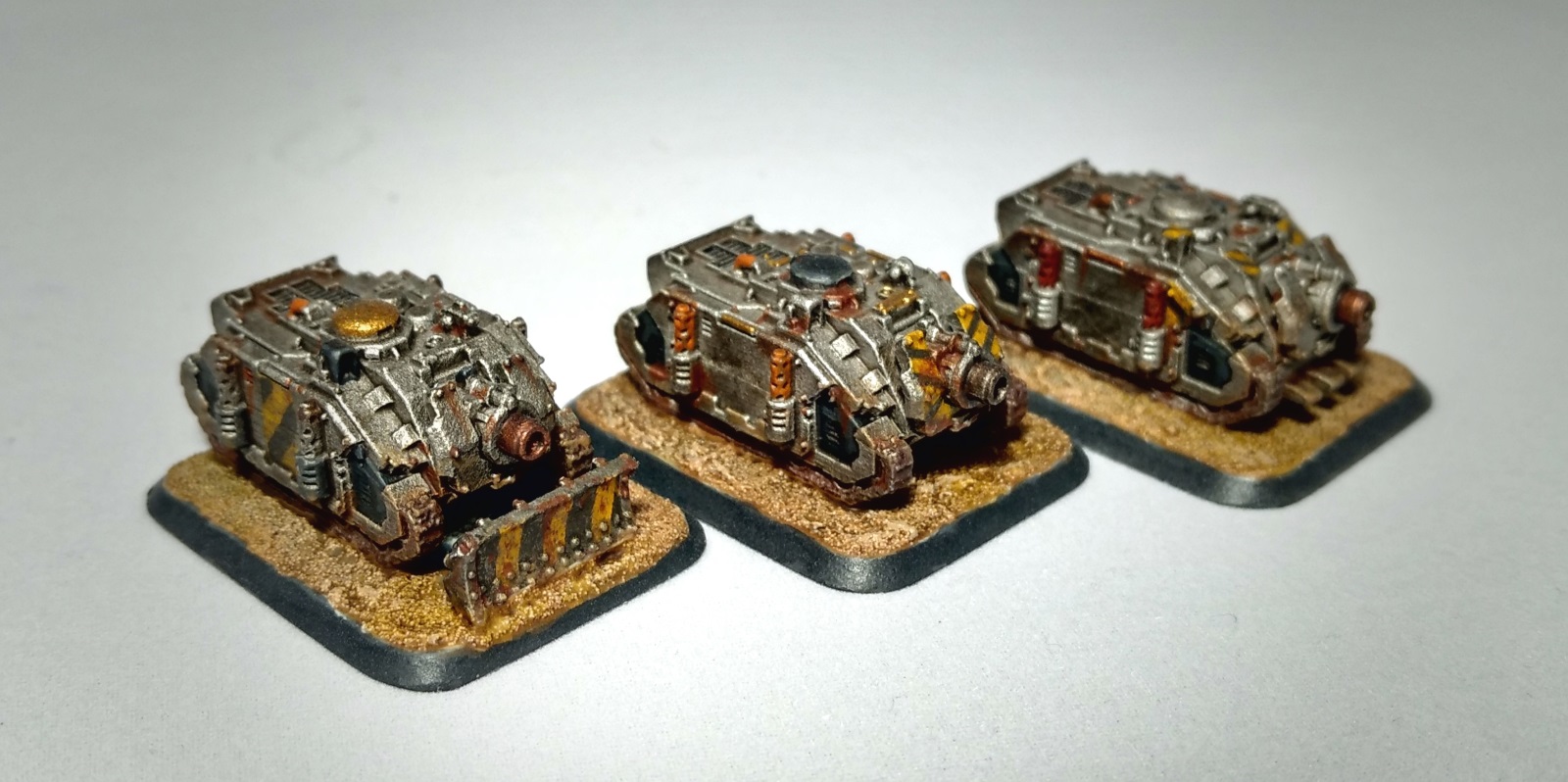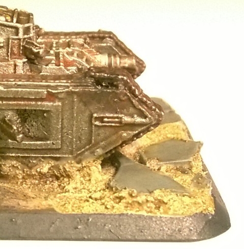 painters notes: More stuff stashed away from the times of naughtiness. The painting approach was similar though I went for an even more used and venerable look to the Malcadors. Grime and rust being found in every track and armour plate. The "damaged" Malcador was actually a pretty serious miscast that obviously I'd be unable to have corrected at this point. I figured that we'd tie that into that tank's story as having thrown a track. Put enough blended grey and black oils on anything and it looks like damage to the eye. I wanted these guys bases to have a serious "in the suck" look as they're moving through a previously heavily bombarded area. Numerous craters were built up from TP mache. Burn marks/rays are light dry brushing/spackling of Vallejo Intermediate Blue and then followed up with a custom blend of weather powders for depth.