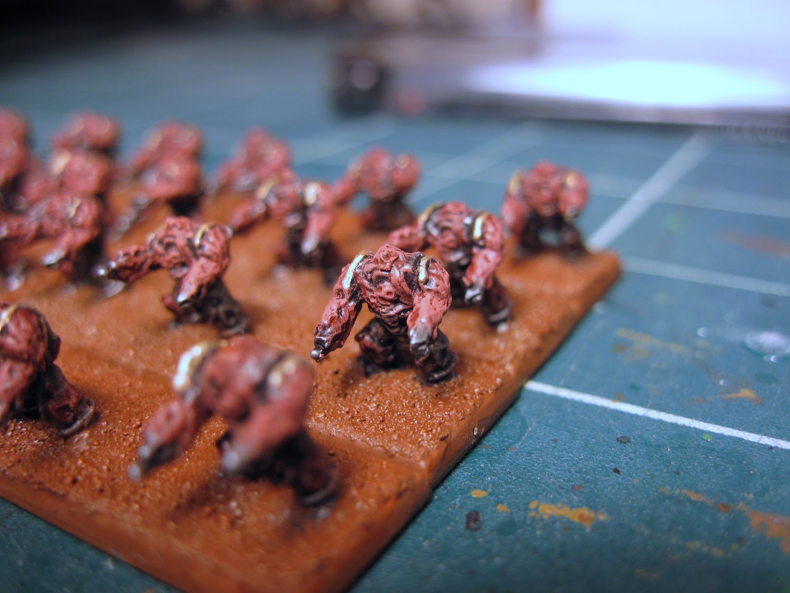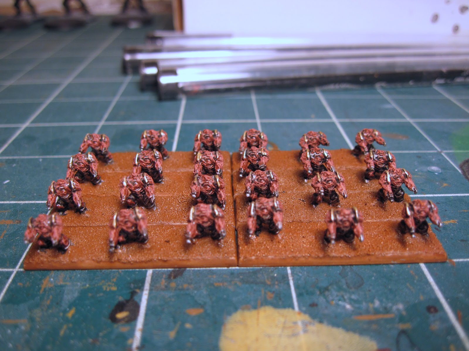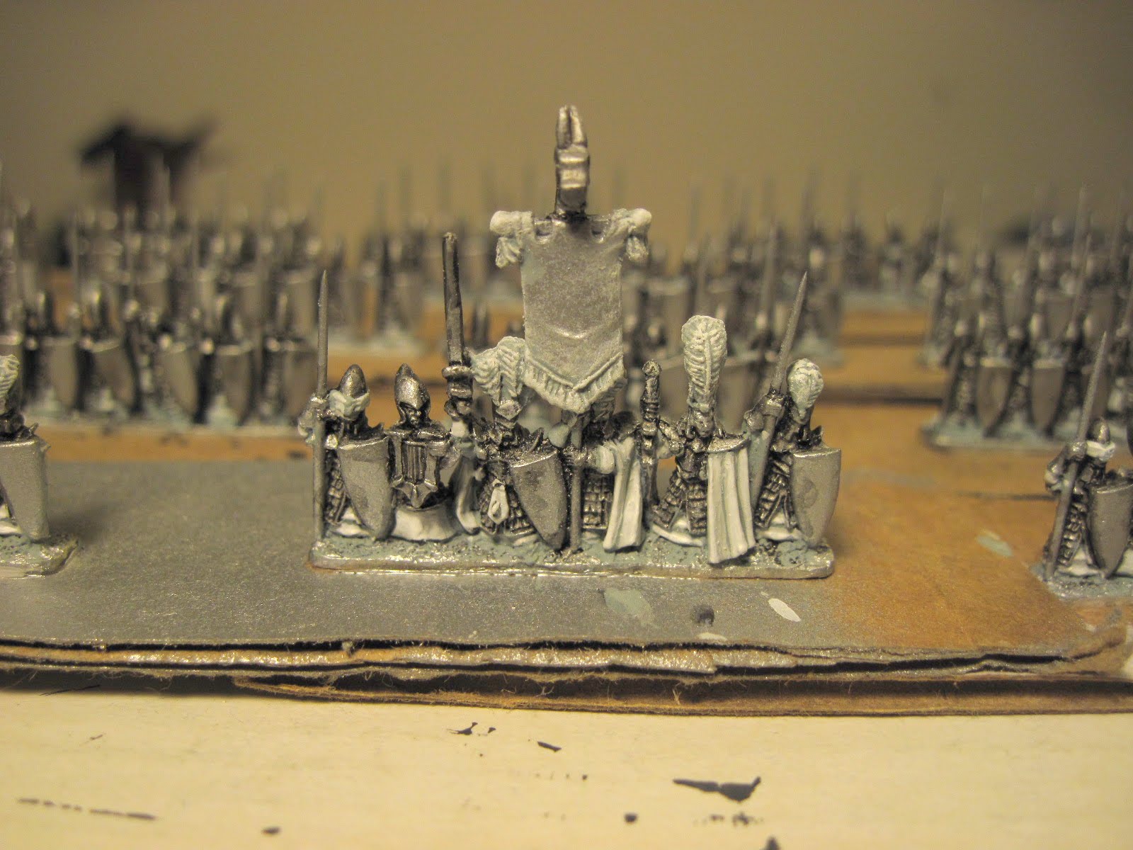 And back to the High Elves! The white is nearly done on the final batch of spears. After that I need to do a bit of repair work (my paints got dropped on a strip and broke 10-15 of the spears) but hopefully I'll be able to finish up the flesh and move on to the leather/wood next week.