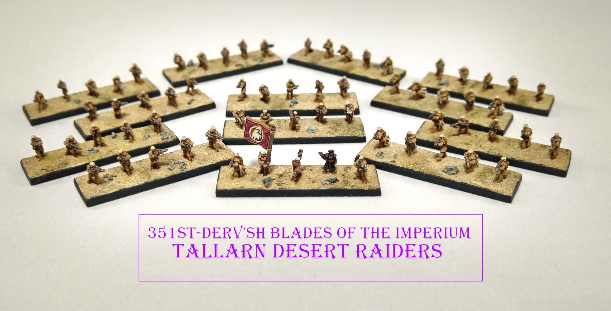 Typical of a Tallarn Desert Raiding force, units of the 351st, the so called "Derv'sh Blades of the Imperium" ranged independently and autonomously of larger forces to great effect. Notorious for their lightning strikes at sunset, they'd infiltrate and attack without warning and just as quickly, melt away into the desert sands.