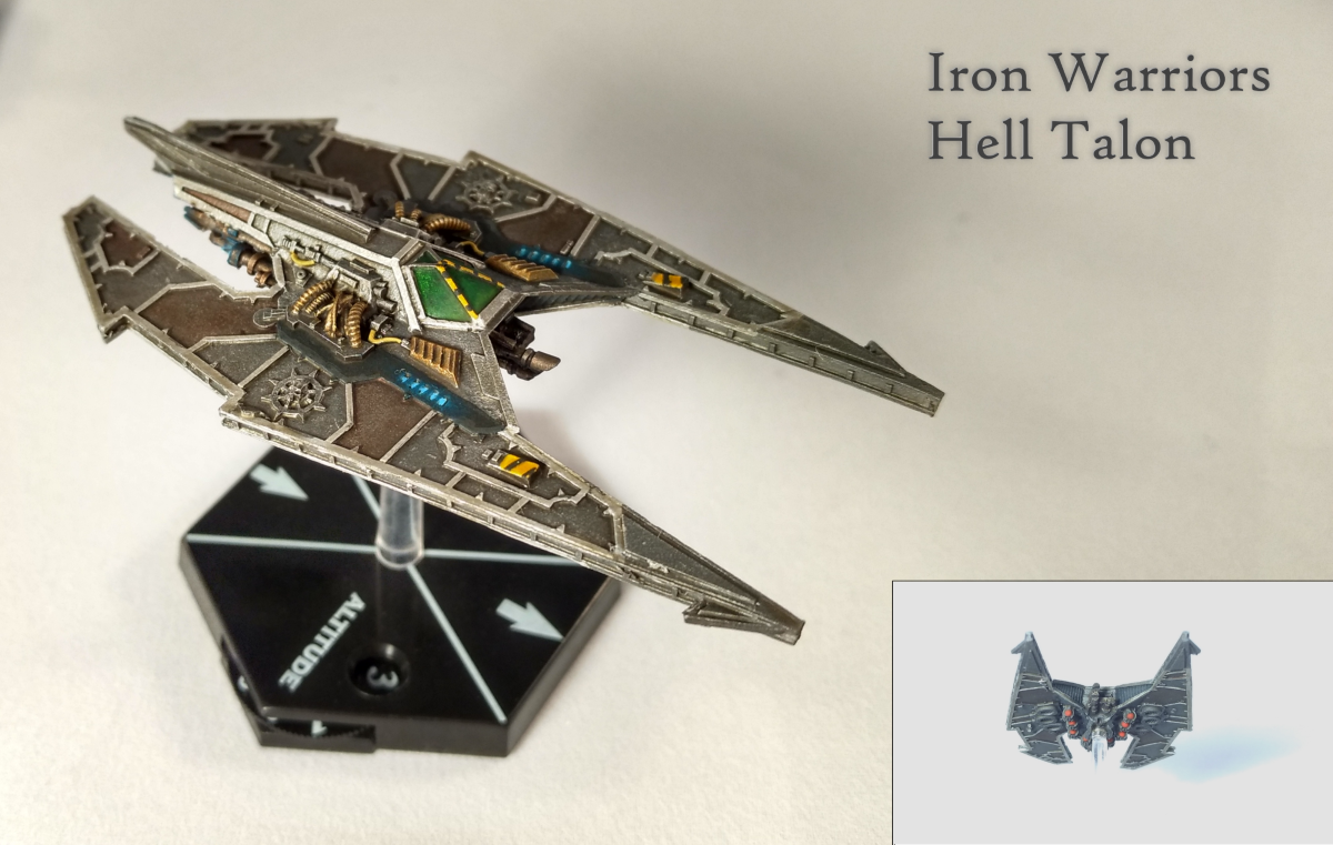 With the appearance of interstellar vessels of the Iron Warriors traitor legion came their aerospace wings as well. Foul contraptions such as these known as Hell Talons were a common sight for the Imperial forces and their hard pressed air crews. Constructed with vectored engines allow for superior maneuverability and a fearsome array of autocannons and missiles, it was superior in air to air combat to almost any Imperial airship of any class present in the warzone. Even more threatening was the large array of precision munitions each fighter-bomber was capable of using in a CAS capacity.Attachment: