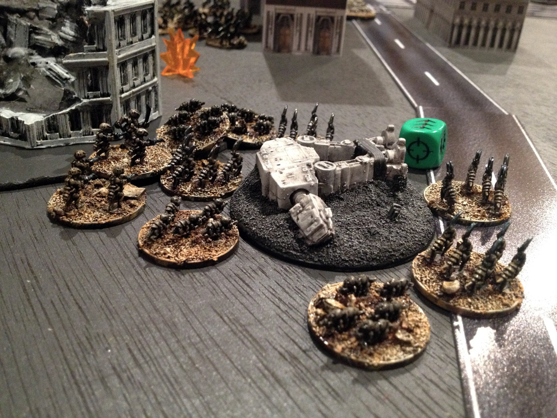 He picks up his two 5+ cover saves from the gun emplacements, rolls… and fails both!!!