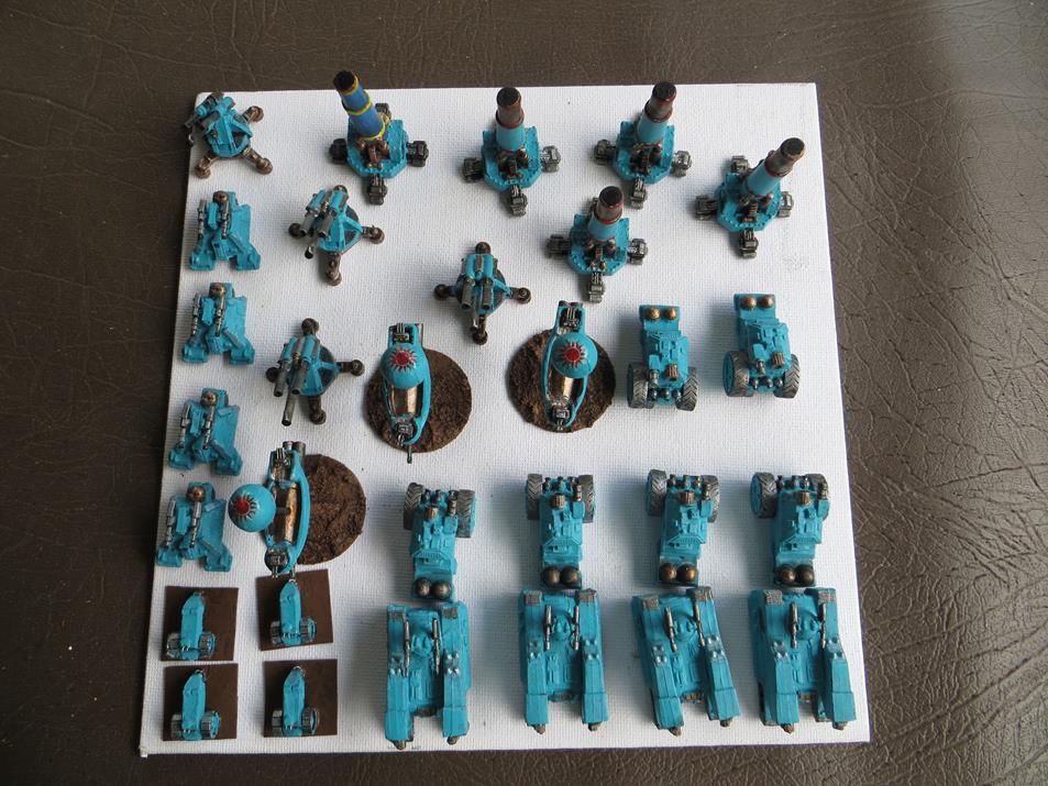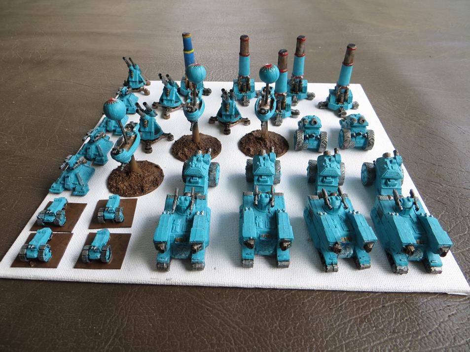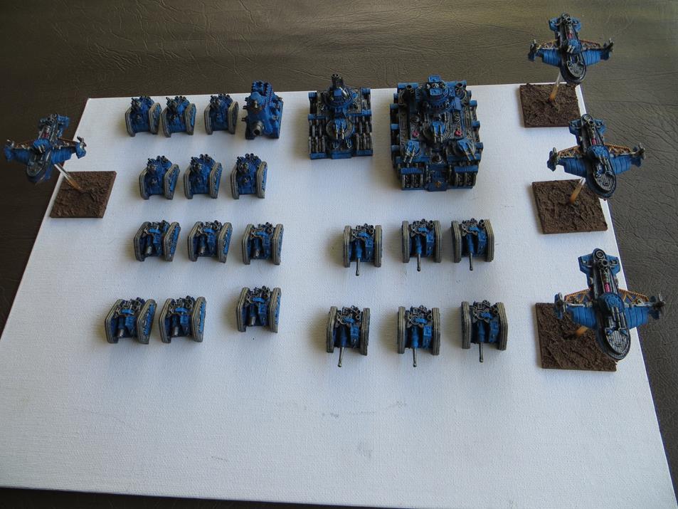 Thanks. Its a mixture of items which includes scratch built items I created out of bits and pieces , 3 tanks built by a TacCommand colleague , an old toy I converted (back row right hand side), kromlech destroyers, a WH40K squat in exo armour, 3 proxy WH40K Ork robots made by a long defunct South Australian company (Chopper Gargants), a GW slasha gargant and 2 converted Brigade walkers.