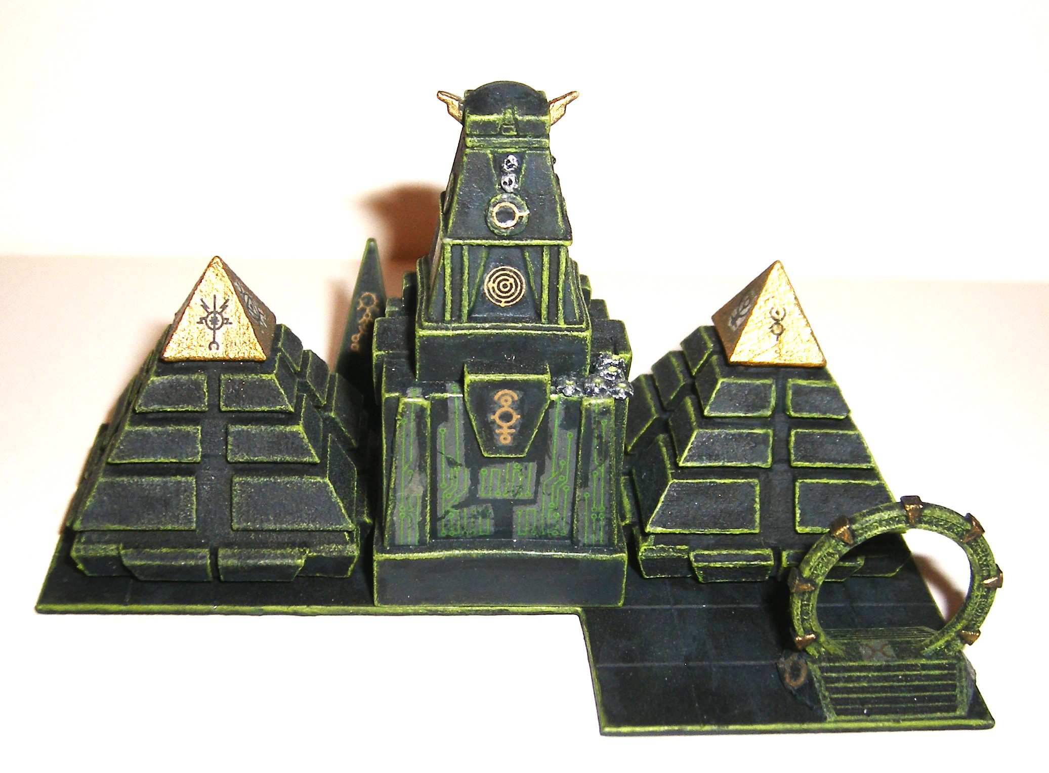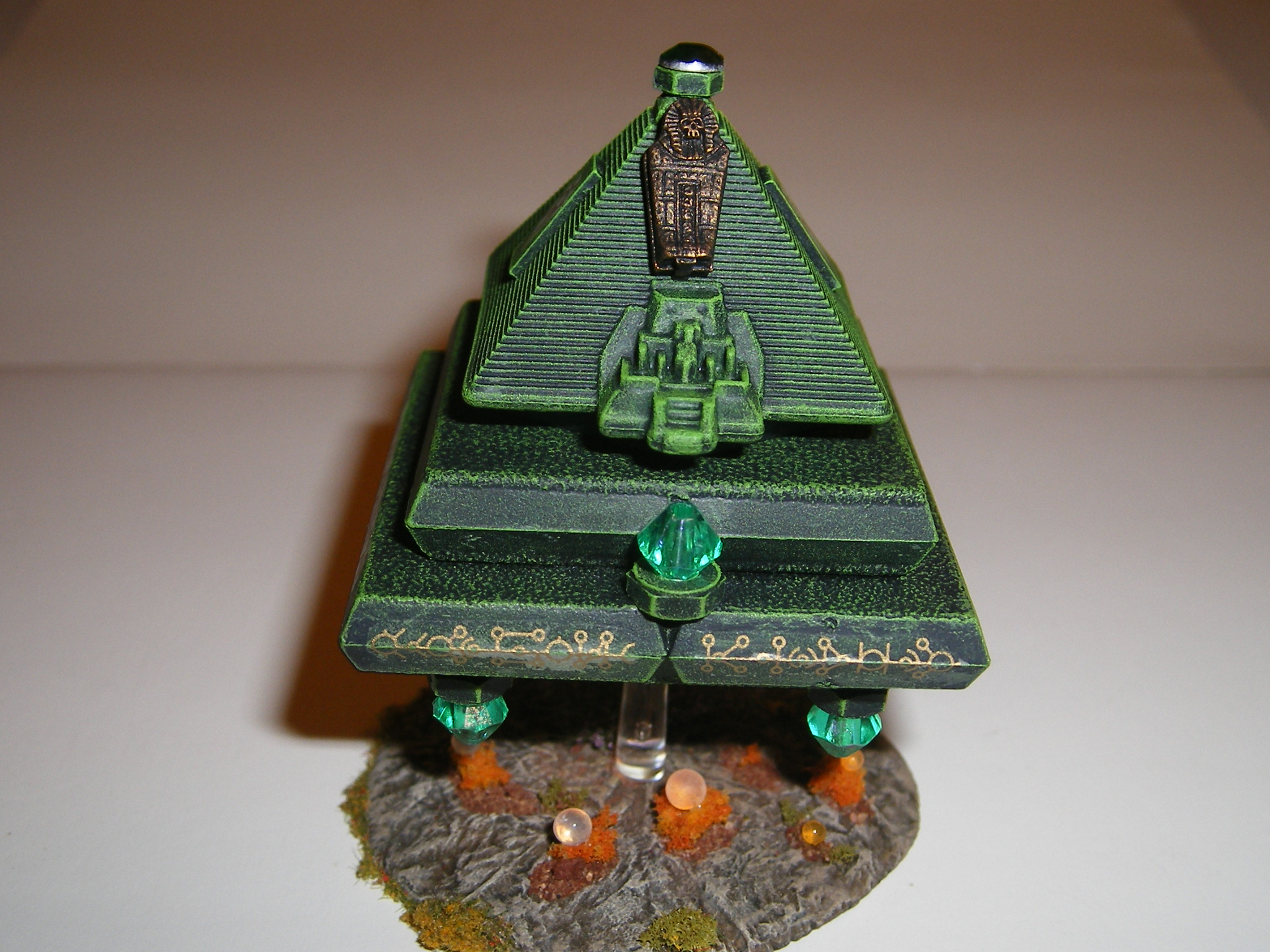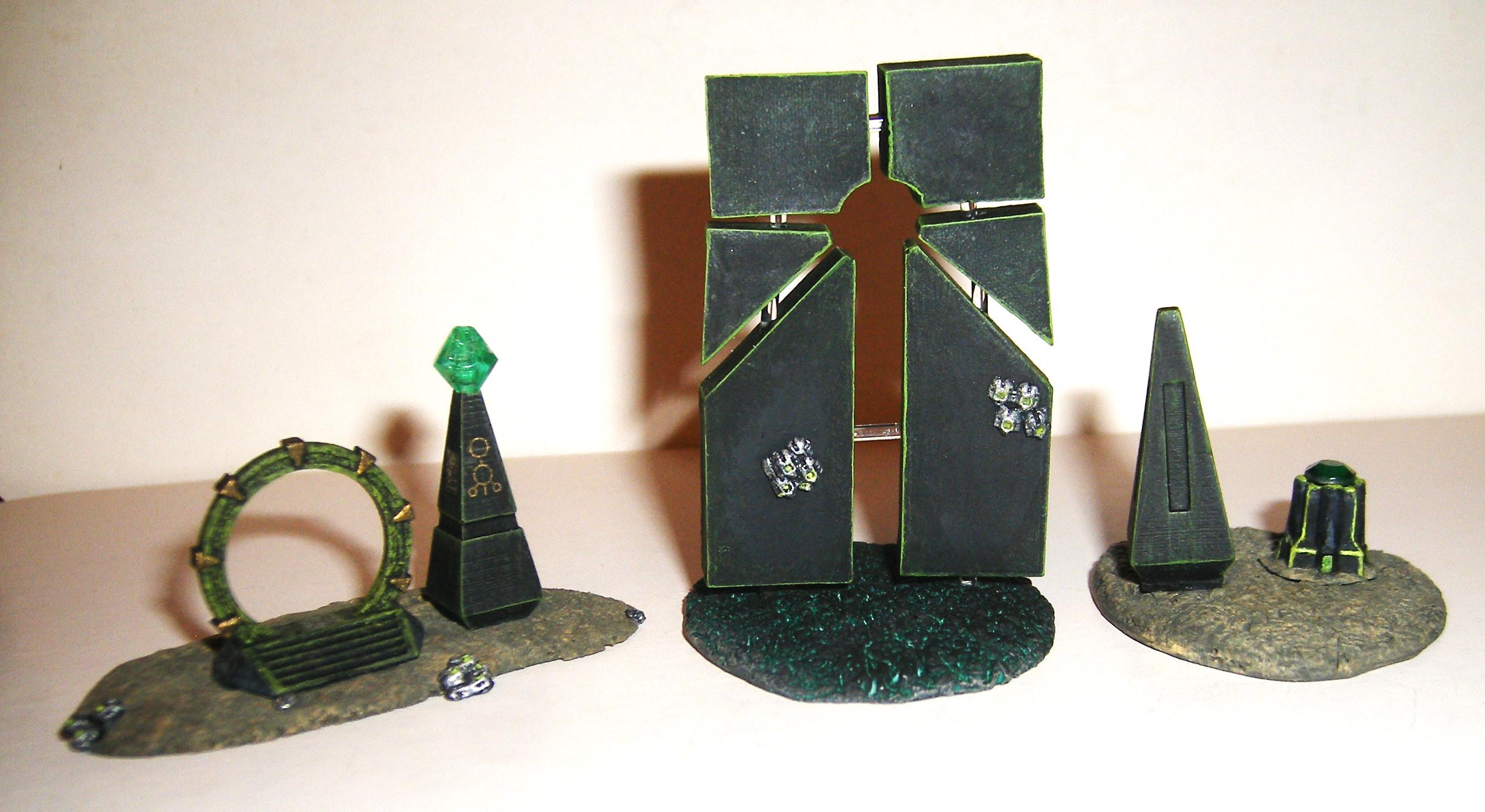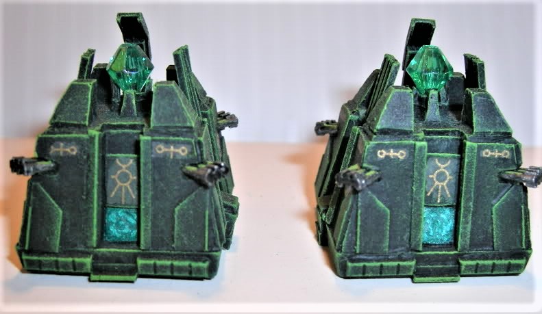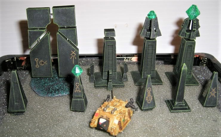 Some of my new Necron terrain. Some are just up graded a bit. I used to flock much of my terrain pieces. But I started to use Woodland Scenic's Liquid Pigment Earth Tones. A tan, a gray slate and earth brown. It's like a thick wash. Looks more like real terrain. Base painting the original models with spray - Black or Tan. The next day just blended the colors. Of course, I use Clear Flat spray to seal it. And the bases I had a buddy make, and I copied then using an Alumilite Resin kit found in craft stores. I'm going to use these for Necron Terrain or Objectives. My other buddy made some Epic scale Scarabs. I sanded the base off and then painted then glued on. Also has some Alumlite pieces with little skulls on them. Cut them off and use them for Necron heads ...