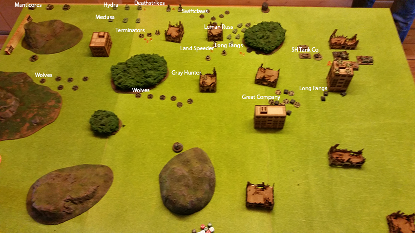 The Three units dropping in was then attacked by everything but managed to hold on, nu formation was totally destroyed and the Gray Hunters managed to move into position on the artillery. Both Wolves and the Swiftclaws marched across the battlefield ready for turn two. On the other side the Gray Hunters and longfangs advanced towards the remaining Superheavy company. The Minervans didn’t manage to rally anything so turn two was pretty one sided and in the beginning of turn 3 I even managed to destroy most of the last Superheavies in a combined assault.