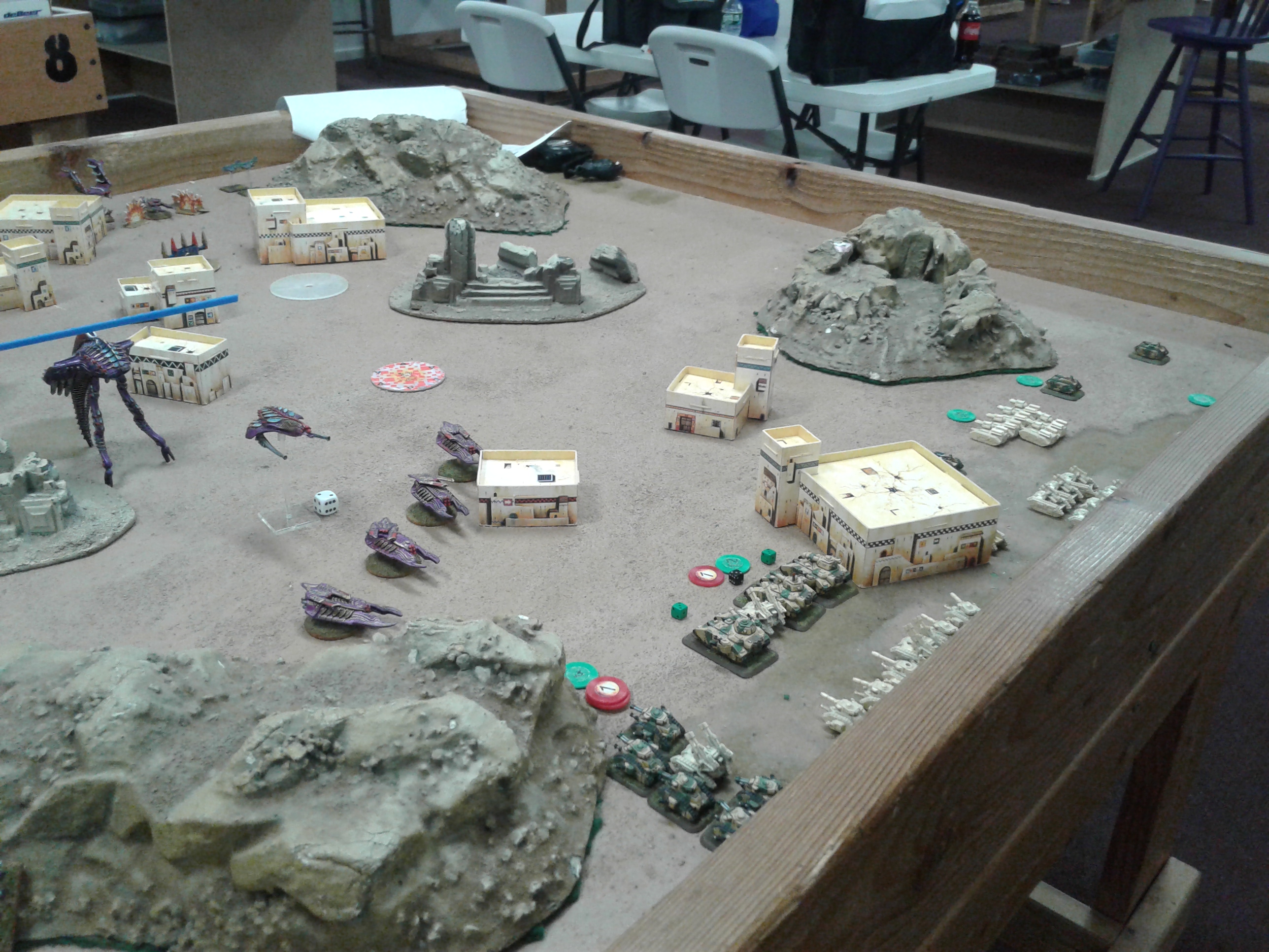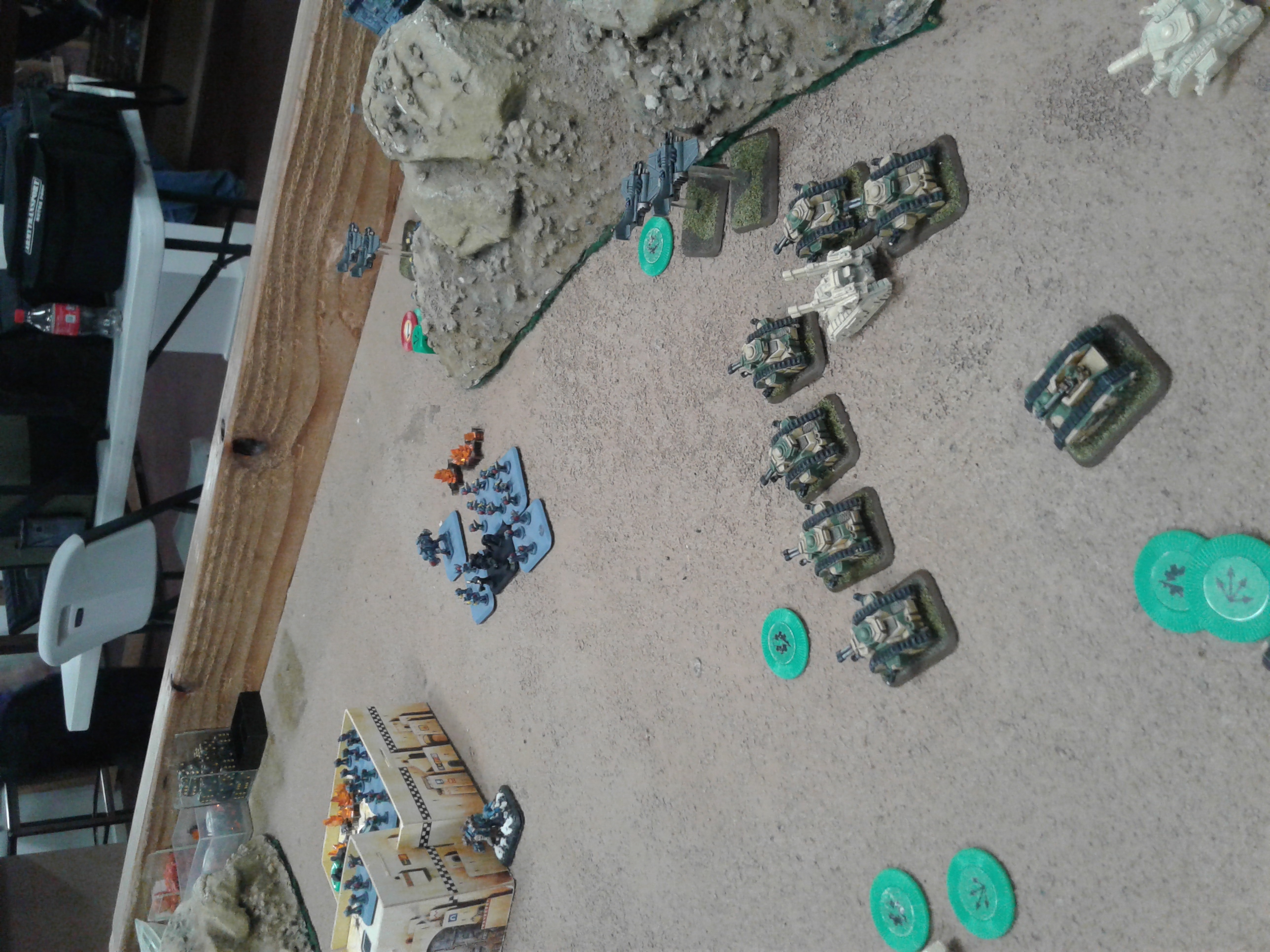 The drop was off target, and left three formations looking at a mountain of tanks. Manticores on overwatched burned it and laid BMs and the SC and some Grey Hunters. Tanks advanced and marines marshaled after that. Turn 2 saw some of the lighter stuff breaking but Russes held the blitz and Baneblades held the center of the table. I was unable to get BTS (a lone Grey Hunter hiding in some rubble) but had T&H and DTF at the end of turn 3 (I think, it might have been turn 4).