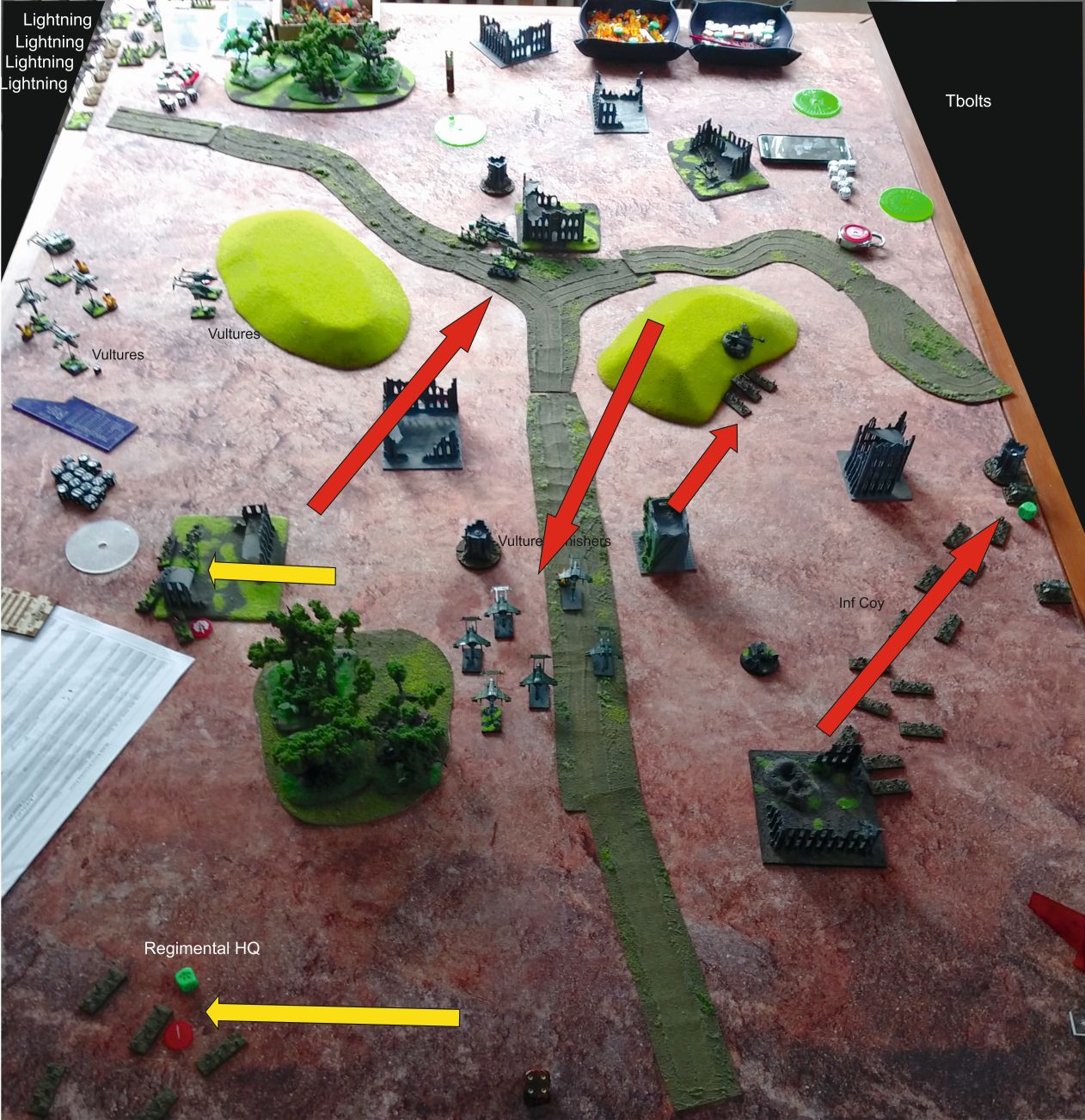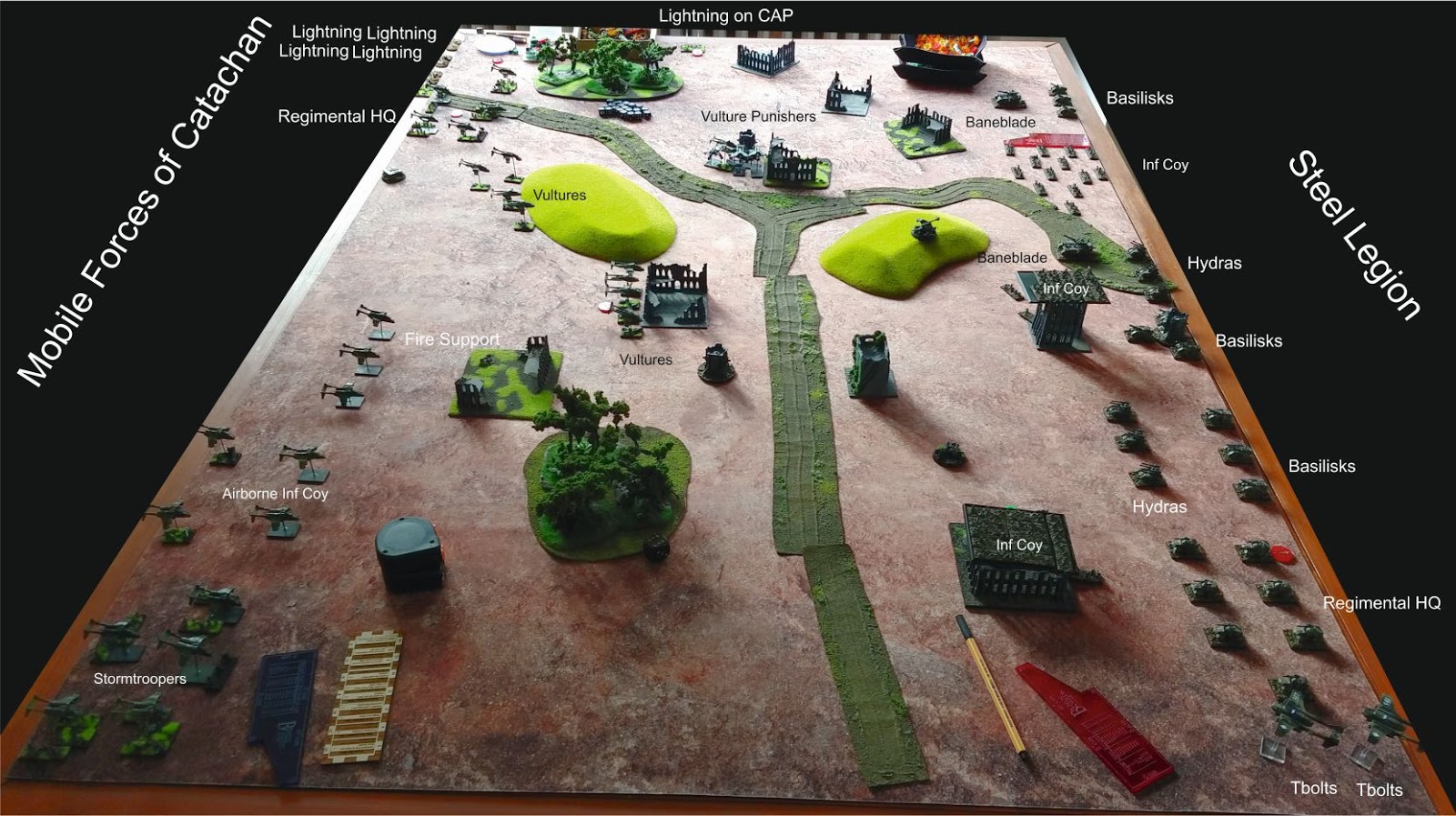 Steel Legion win roll of for deployment and settle for long edge. Mobile Forces put up a pair of Lightnings on CAP, as well as a Vulture FM. Steel Legion put up tow Inf coys as garrissons, see picture for other formations. I made a slight error in the picture, lableing an infantry formation wrongly as "Stormtroopers". Sorry for that.