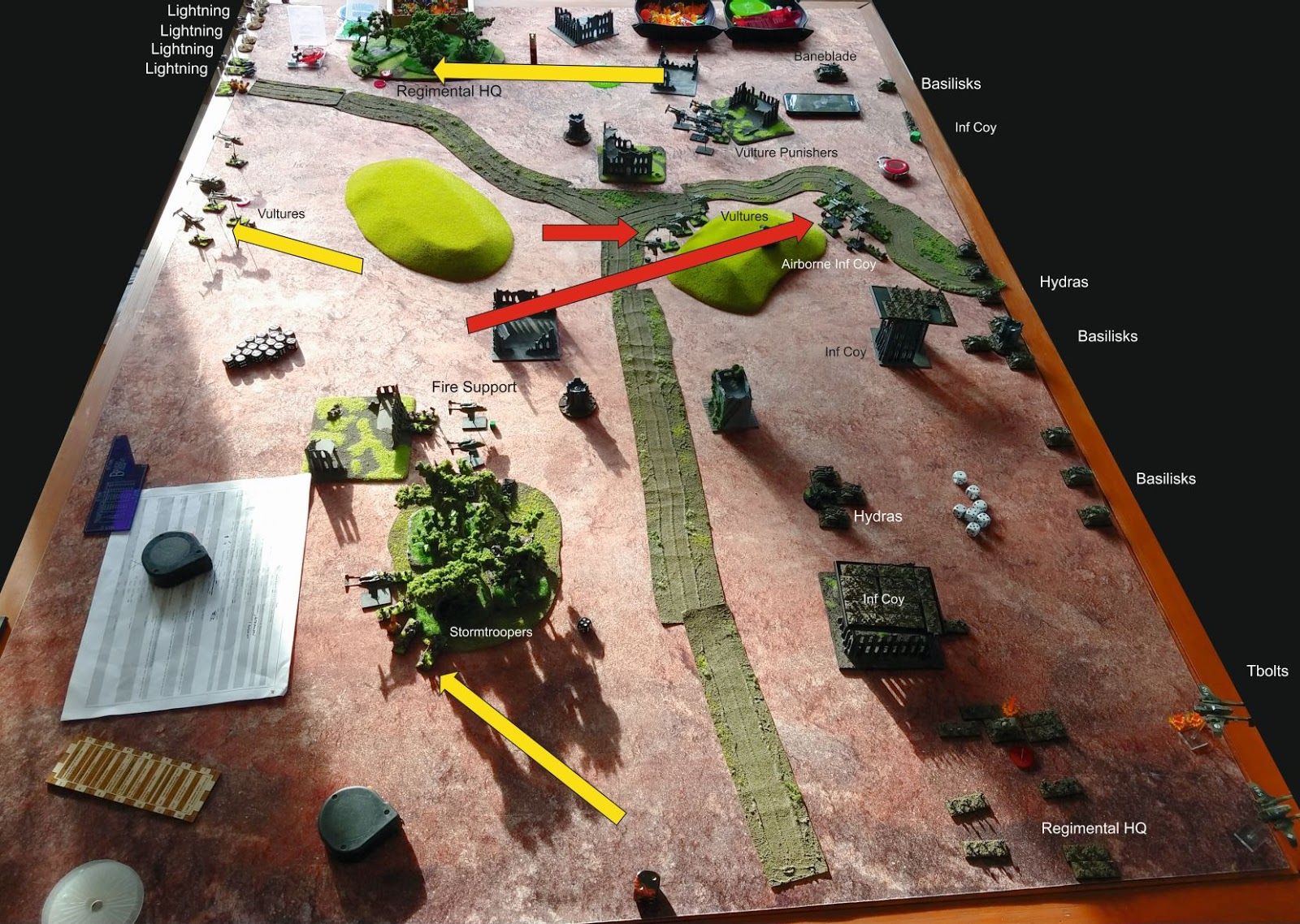Leman Russ support company activates and accidently moves themselves between two enemy units, they can't do any damage. In turn they take damage and break, withdrawal ends them in dangerous terrain where they loose 2 more tanks. Lightnings swoop in to finish them off.
