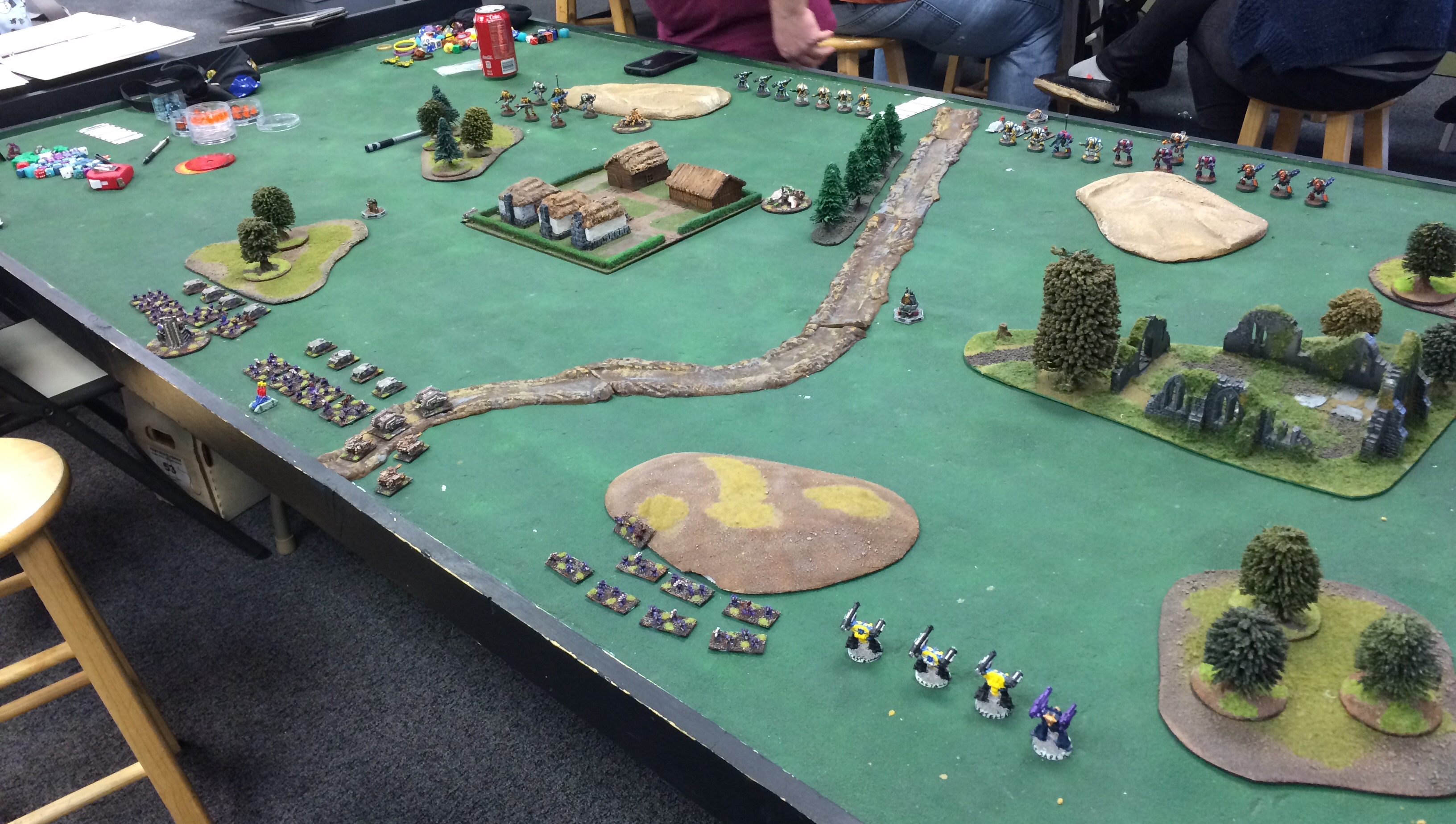 So at the end of turn two, his AA guns gone and knight errants gone, his Paladins on the left were broke (but rallied), the right was looking good, the left was the issue. Everything of mine rallied as did his.