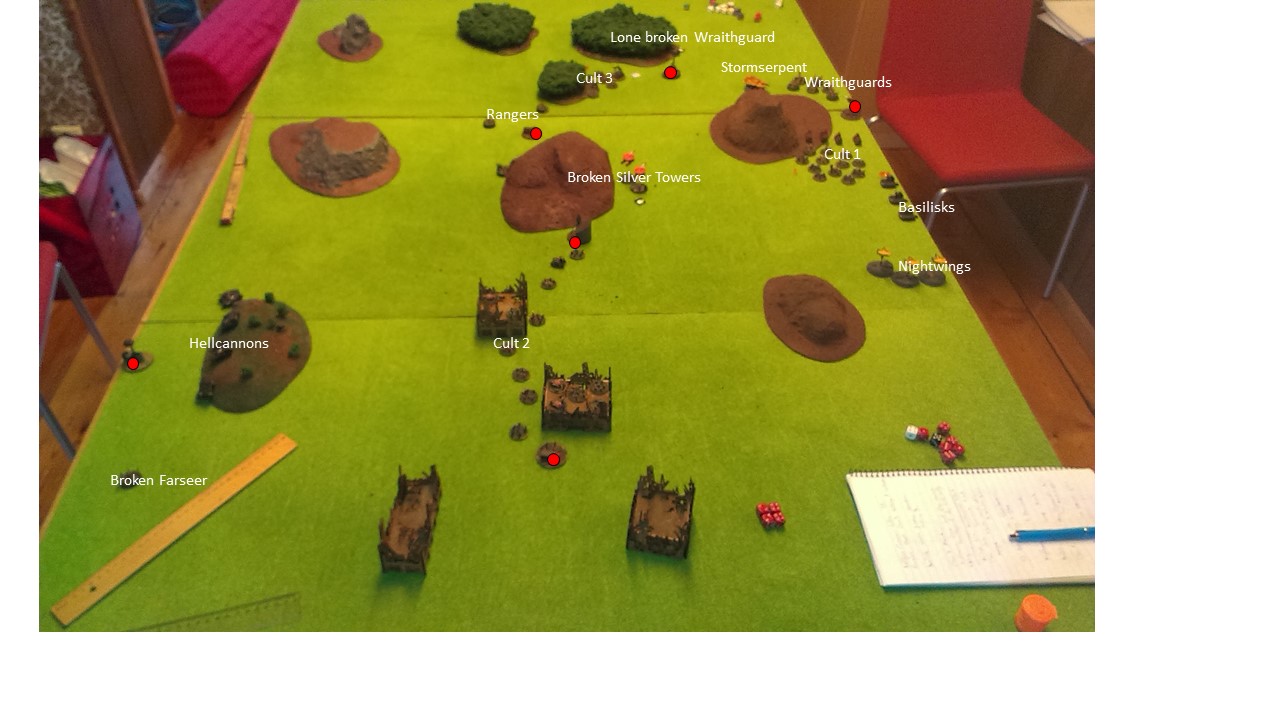 Wraithguards and Wraithlords is really tough. The Cult had very little MW so the soaked up a lot of damage. Wraithlords is really difficult to use since they want to get into CC but only moves 15cm. Waveserpents and other skimmers is good to have if you face CC monsters.
