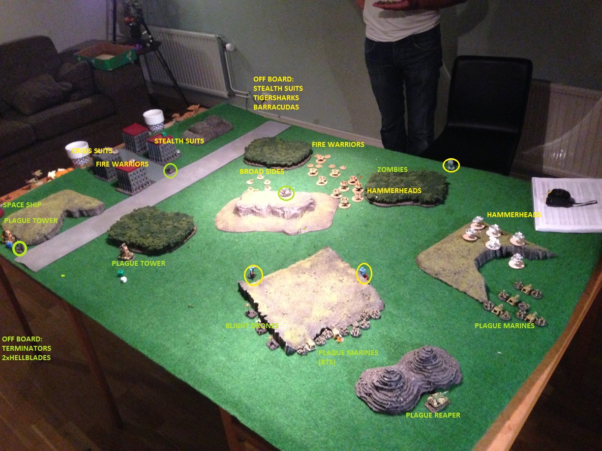 T: Tigersharks ground attack plague tower by Deathguard Blizt. 2DC is made (3BM). T: broadsides retain initiative with the help of SC and sustain on plague tower by blitz, 2DC is made and the formation breaks. D: Hellblades ground attack stealth suits for 1BM. T: garrisoned fire warriors doubles into buildings in front of them on the lef flank. D: hellblades ground attack hammerheads on right flank for 1BM. T: Barracudas ground attacks plague marines (BTS) on right flank,1 rhino is destroyed (2BM). D: plague tower engages stealth suits in forest, 3 stands are killed and no damage is done to te WE. T: hammerheads on righ flank advances and fires on Blight drones, 2 drones die and the formation breaks. D: plague marines marches down the right flank (i totally forgot about the no marching rule, but when i looked i couldn't find it in the new list anywhere). T: Crisis suits marches down on the left flank D: plague marines (BTS) doubles into cover of a hill on right flank. T: fire warriors in middle of Tau deployment zone holds and moves forward. D: plague reaper marches to the right flank. T: hammerheads in middle holds and moves forward. D: Plague ship bombards the ground by Tau Blitz hitting nothing and 3 plague zombies spawns.