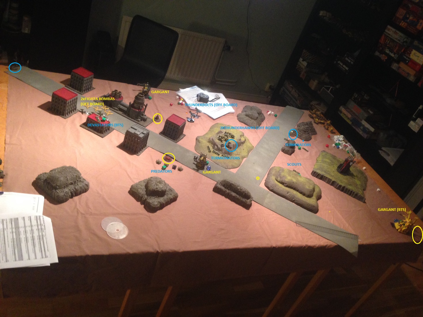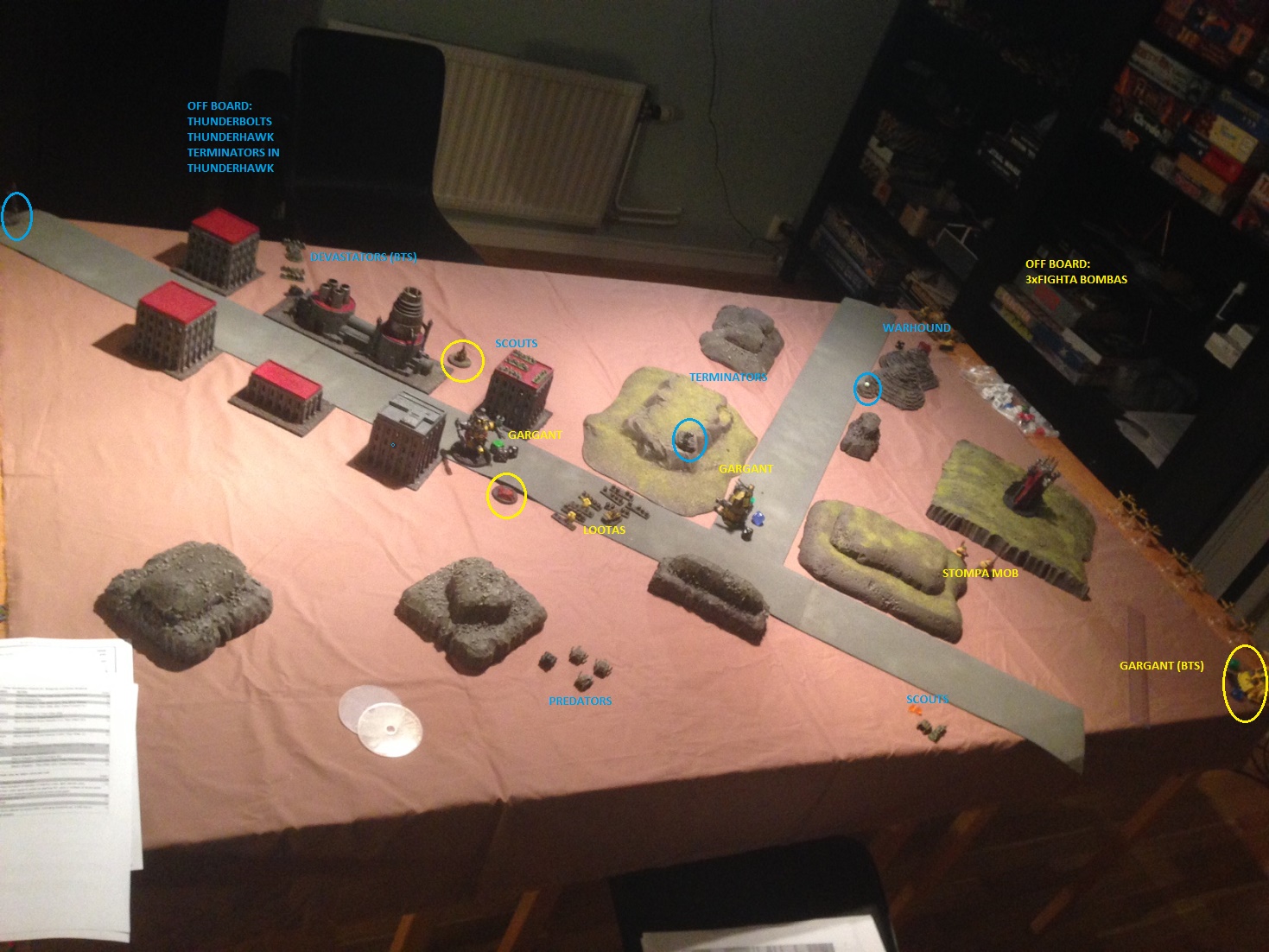 SM: scouts doubles and fires on stompa mob breaking it. SM: predators retain and sustain on gargant doing 2DC (3BM). O: fighta bombas ground attack scouts in building. hunter AA from devastators shots 1 of them down. the fightas only manage 1BM on the scouts. O: fighta bombas retain initiative and ground attacks warhound on right flank. they do 1DC which is a crit and the warhound is destroyed. SM: scouts sustain on lootas killing 1 stand of boyz (2BM). O: lootas doubles and spreads out to cover 2 objectives. they fire on scouts in building for 1BM. SM: terminators doubles to T&H objective. they fire on broken stompa mob killing 1 stompa due to BM:s. O: fighta bombas go on CAP. SM: thunderbolts ground attack lootas. 1 killa kan and 1 grot are killed (2BM). O: gargant engages scouts wiping them out for no losses. claims T&H. SM: empty thunderhawk ground attacks lootas killing 1 boyz and 1 grotz breaking the formation. O: Gargant by ork blitz advances and fires on scouts for 1BM. SM: devastators doubles up to T&H objective to deny the Orks T&H and to be in support range of the coming assault on the gargant. they fire on it for 1BM. SM: terminators in thunderhawk ground assaults gargant. fighta bombas intercept but are shot down by 2 hunter AA shots. terminators do 2DC on the gargant for no losses and wins the combat.