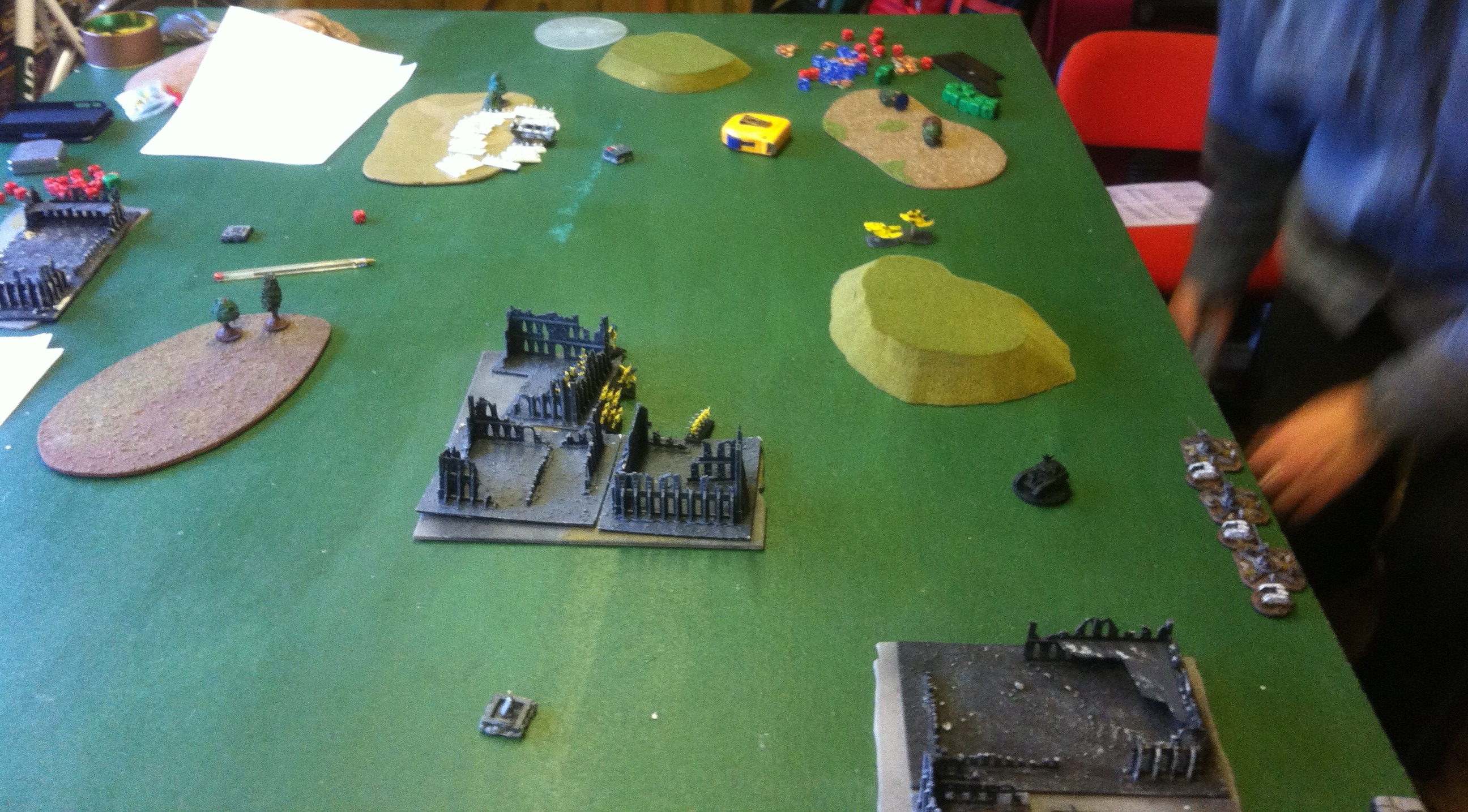 Turn 3 – Iyanden win Strategy I. WG (BTS) double across to Reg HQ shoot for a BM I. WG engage Reg HQ clipping (12 infantry & 2 gorgons) DKoK get 4 hits and kills. WG win with supporting fire and RegHQ breaks and redraws D. Rallied IC marches forward to take DtF objective I. SoV(FP) double (finally) shoot Shadowsword 2 hts saved 1BM) D. TBolts GA – fail I. SoV(Fal) double on re-roll place BM on most advanced IComany D. Hvy Tnk advance and fire on WG(BTS) for a BM I. WG(SC) stay on Overwatch D. TBolts GA EoV breaks it D. Shadowsword sustains at WG(BTS), Vulcano Cannon misses, HB hits and kills a WG. D. Support Art sustains on WG(BTS) to break them. WG fall back through cover. D. IC doubles and shoots at WG(SC) for BM WG(BTS) rally to prevent 2-0 win to DKoK (DtF & TSNP) 1 formation of Thunderbolts shot down RegHQ, SSword, Flak rally for DKoK. IC companies fail to remove BM WG(SC), Falcon rally, WG & broken SSerpent fail.