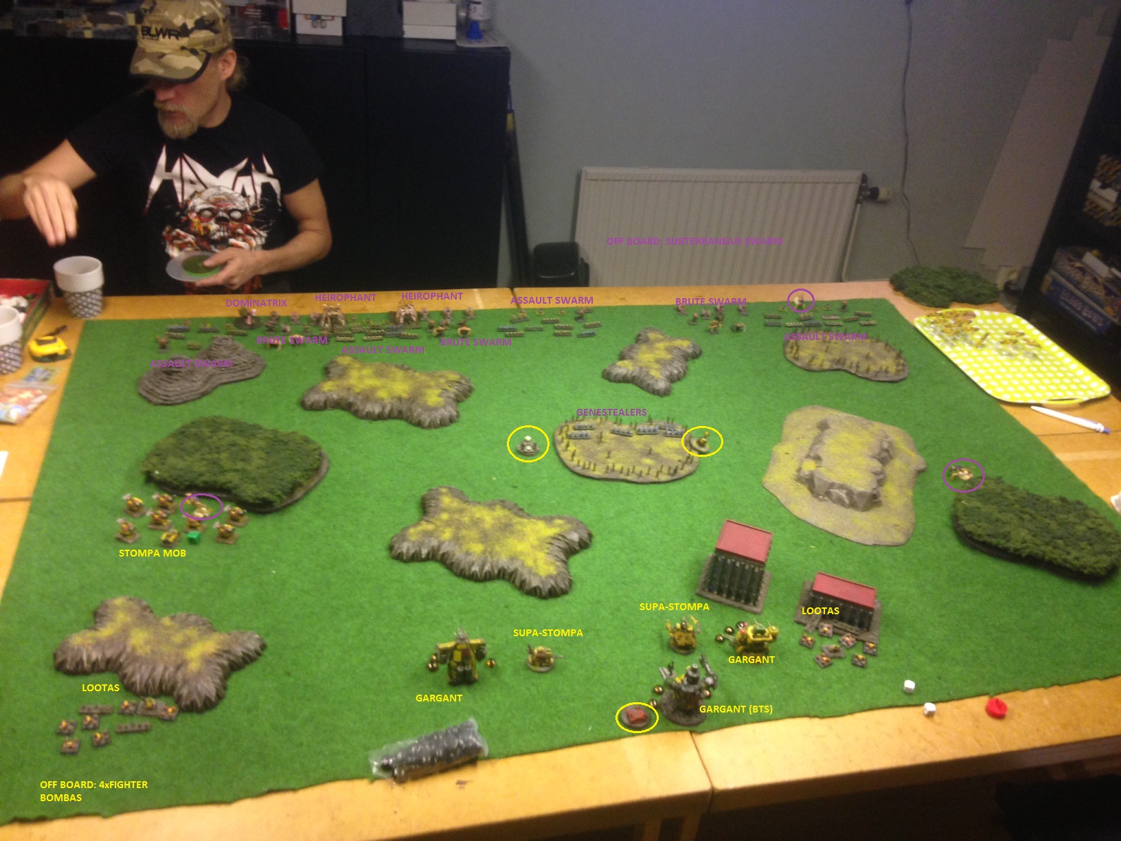G: supa stompa doubles towards middle and fires on assault swarm killing 1 termagant, 1 hormagaunt and 1 tyranid warrior (2BM).