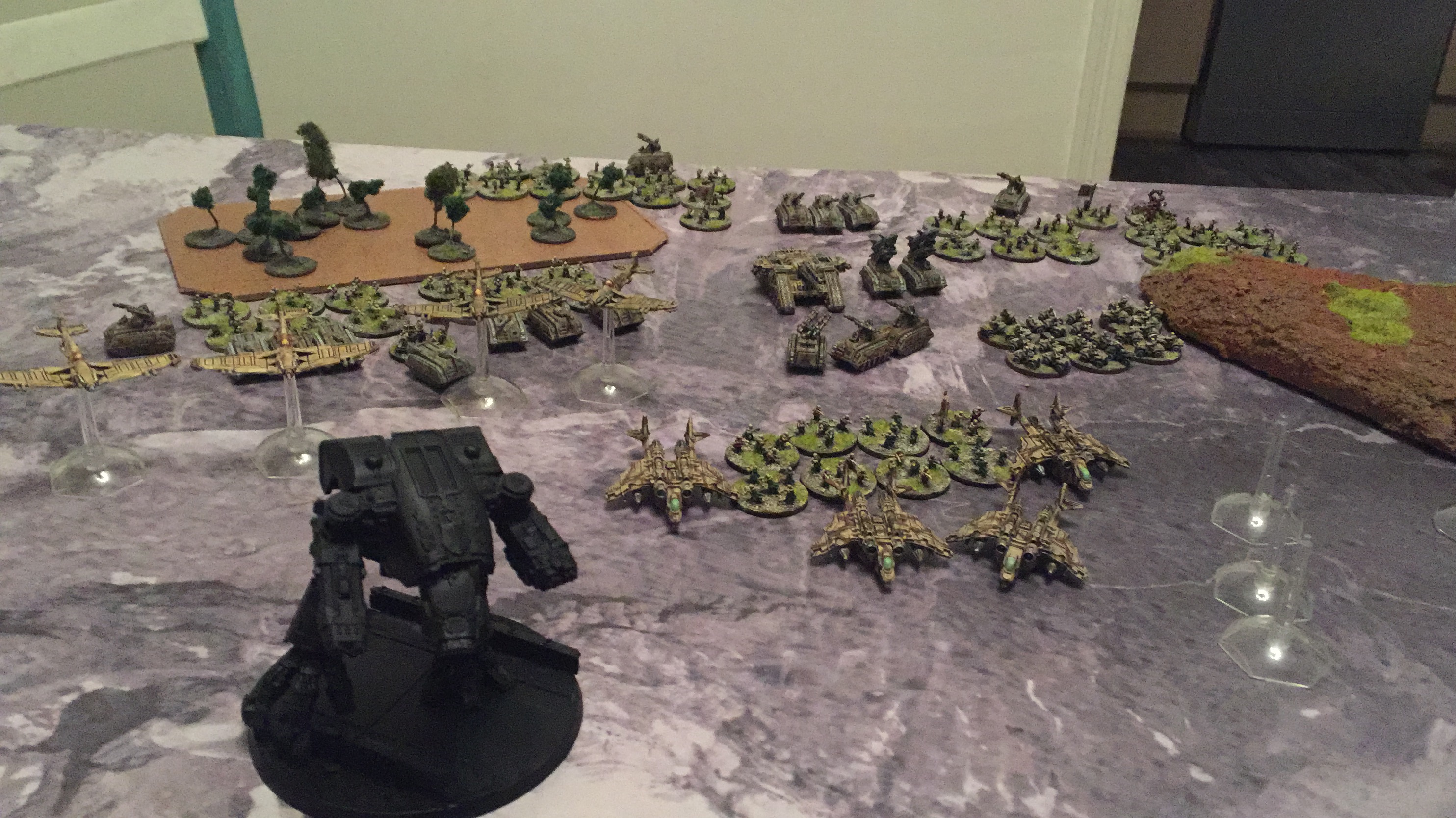 Orks were helped by both sets of Thunderbolts failing to go onto CAP. Both sides went into a holding pattern of the Guard holding back activations and the Orks doubling/marching forwards. Except for a Supa-Stompa that fired on an Infantry company with a massive 15BP. The company were in cover but still took a load of wounds and BM. Soopa Gargant doubled up and shot two Valkyries.