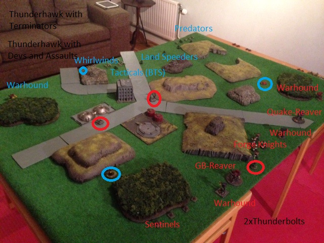 SM: Thunderhawk with Devs and Assault retains and ground assaults the same Warhound. Thunderbolts intercept.Defesive flak from the Thunderhawk forces Thunderbolts to Jink. The Warhound is destroyed for no SM losses. Both marine formations consolidate backwards behind a hill.