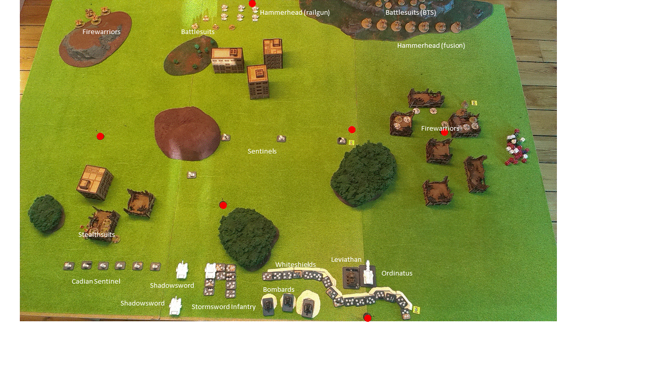T: Coordinated fire with Suits (BTS) and Firewarriors against the Leviathan. Firewarriors and Suits move and fire. (Whiteshields fire from OW but the Tau saves all hits.) Tau causes 4 hits on the Leviathan destroying one shield and causing one wound.
