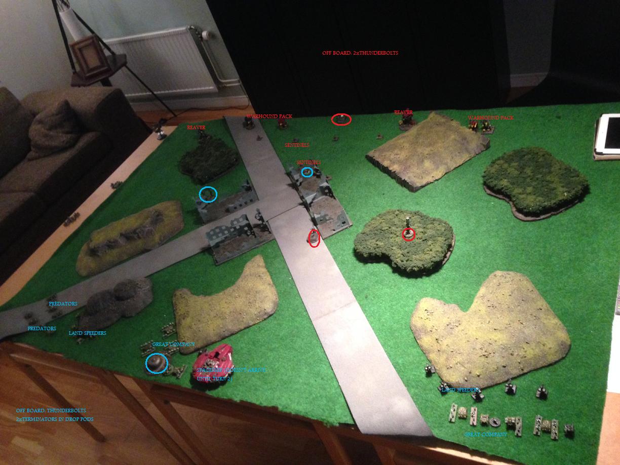 T: reaver on left flank goes on OW and awaits the drop podding terminators on the next turn.