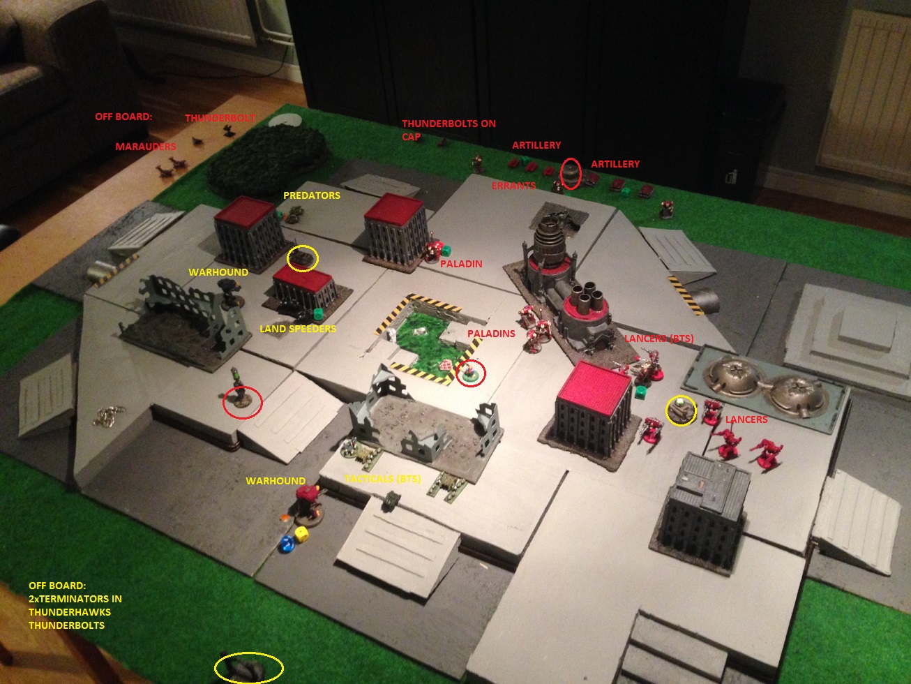 My opponent garrisoned his land speeders on the left flank, otherwise deployment looked like this: