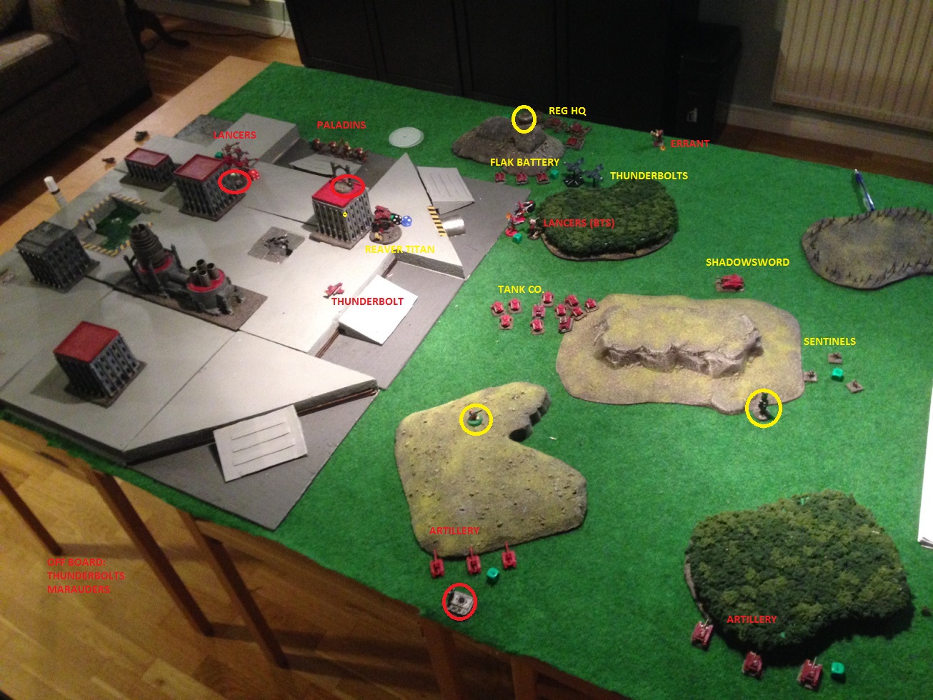 K: artillery sustains on deathstrikes destroying them. SL: thunderbolts stand down. K: artillery sustains on flak battery for 1BM. SL: sentinels on left flank marches forward into city. K: errants on right flank doubles forward behind large hill. SL: seninels on right flank holds and moves into forest. K: paladins in middle doubles forward thru the city. SL: flak battery holds, even with the help of the SC, and regroups. K: paladins on left flank doubles forward into city. SL: shadowsword on left flank doubles forward into city and fires on paladins for 1DC (2BM). K: thunderbolts ground attack sentinels in city killing 2 and breaking the formation. SL: shadowsword on right flank doubles forward behind large hill and fires on paladins in city. 2 DC is made (3BM). K: thunderbolts ground attack reg hq, hydra AA does 1BM, and kills 1 chimera (2BM). SL: reg hq goes on OW. K: marauders ground attack reg hq, hydra AA does 1BM, and kills 2 chimeras and 3 stands (7BM). SL: tank co doubles forward in centre and fires on paladins in city. 1DC is made and the formation breaks. K: lancers on left flank doubles forward thru the city and fires on reg hq for 1BM. SL: reaver titan doubles forward and fires on broken paladins wiping them out. K: BTS-lancers advance forward and fires on reaver stripping 2 shields (1BM).