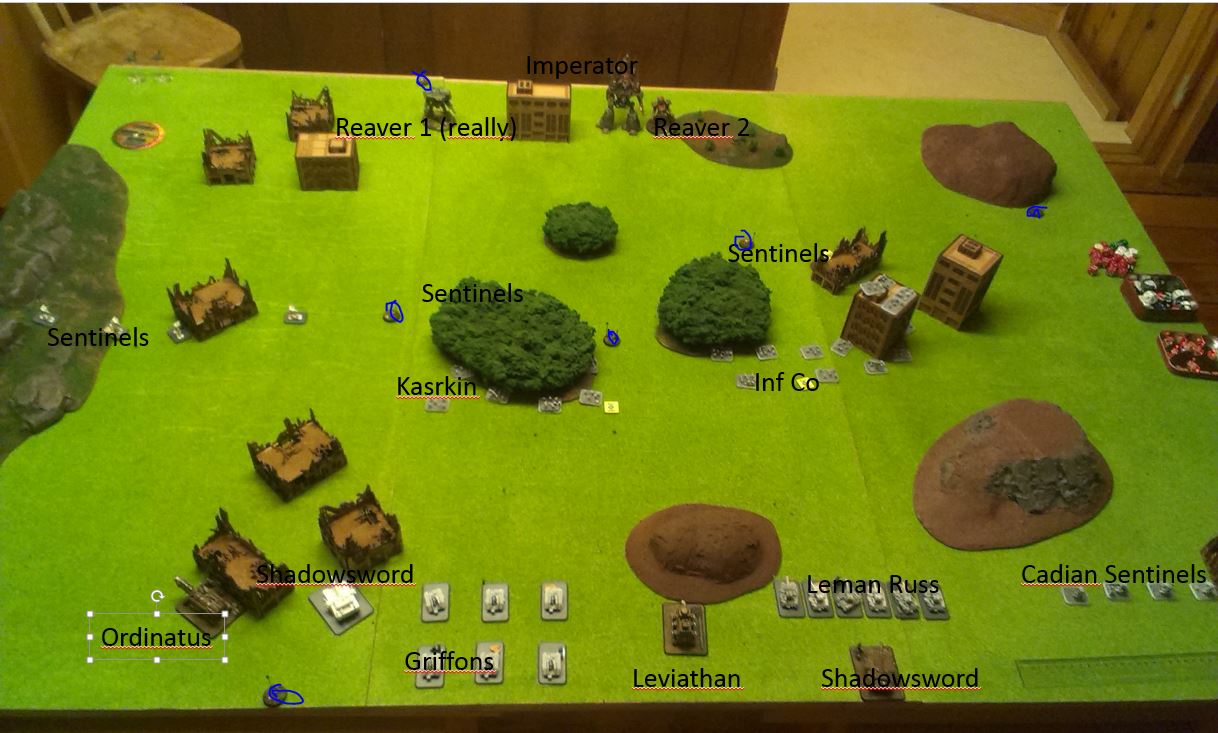 My plan was to take out the Cadians for a spin, I tailored the army a little to be facing titans with lots of activations and perhaps a Shadowsword or two more than usual just because of my deep loss before. The Titan player promised that he would go easy on the Plasma Destructors this time but still smiled