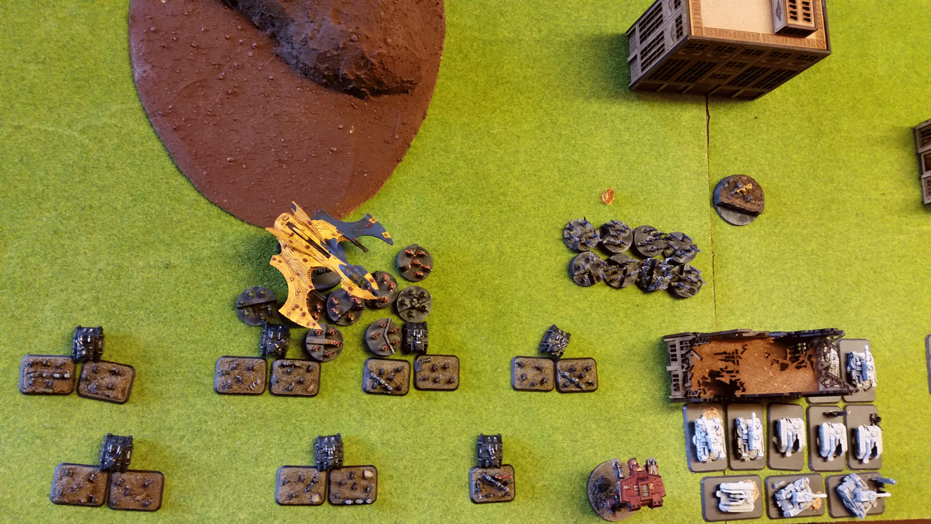 1. Vampire Raider with Aspect Warriors assault the Regimental HQ with support from Swooping Hawks. The Vampire lands just outside of Flak AA umbrella. Wins the battle with 12 kills against 2 so the HQ is hacked down. The surviving Aspects move into supporting range for the next move.