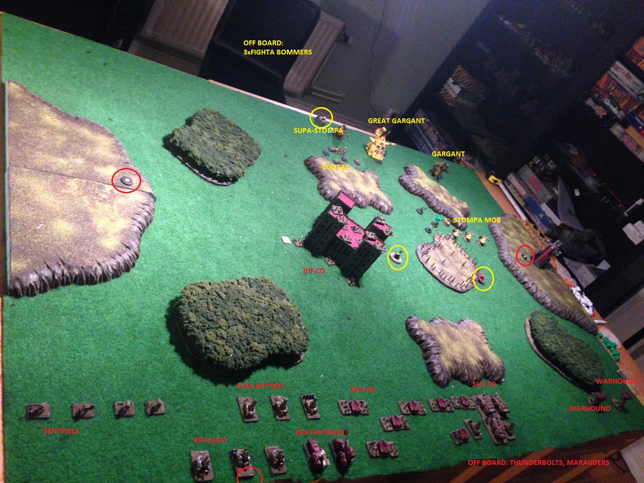 Stompa mob garrisoned on the right flank next to a forest. Lootas garrisoned behind a hill near the blitz. Inf Co garrisoned in the Battlescene design Guildhall of awesome in the middle.