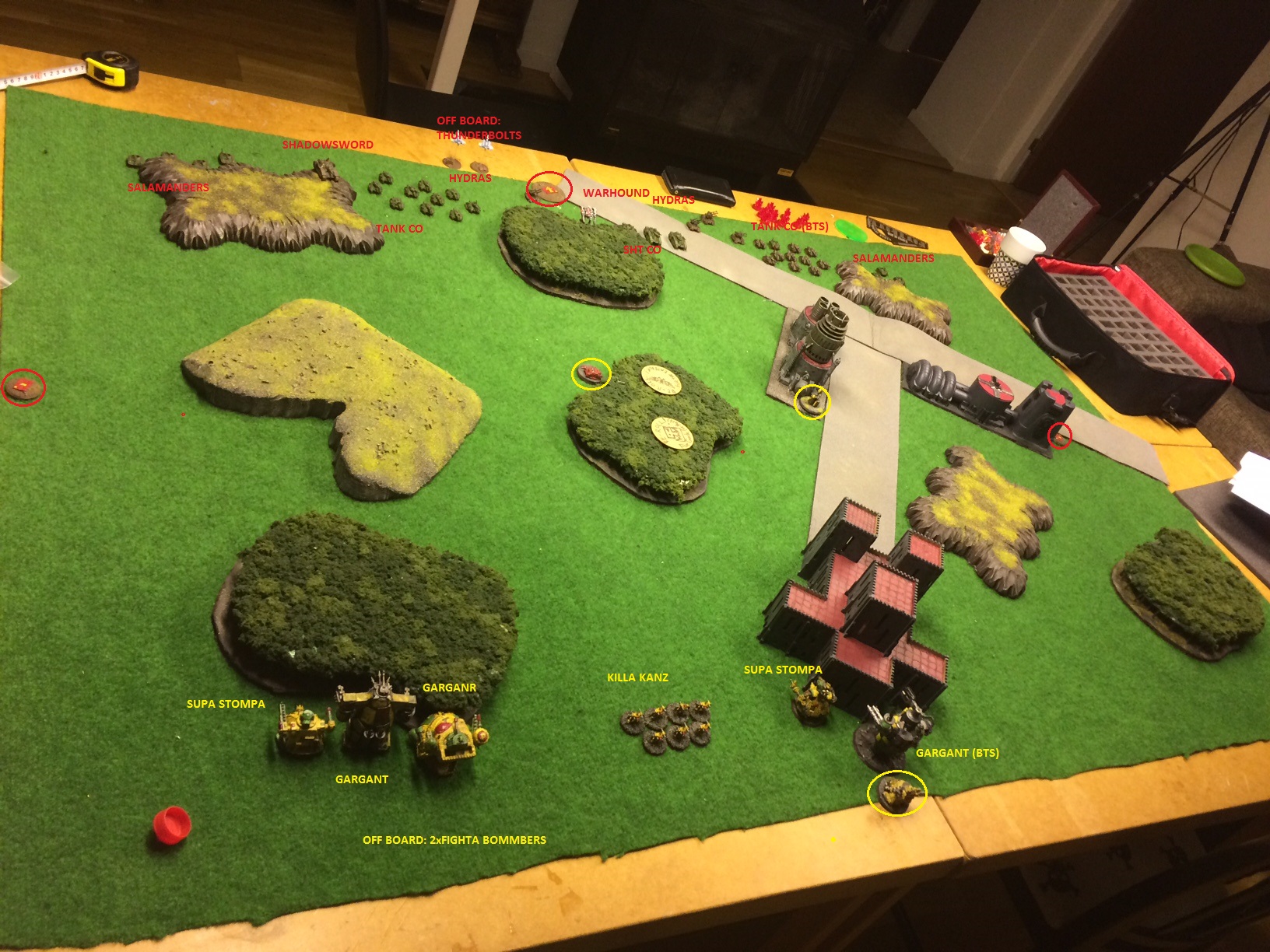 M: Tank co on left flank advances towards Supa-Stompa and fires on it stripping 1 shield (1BM).