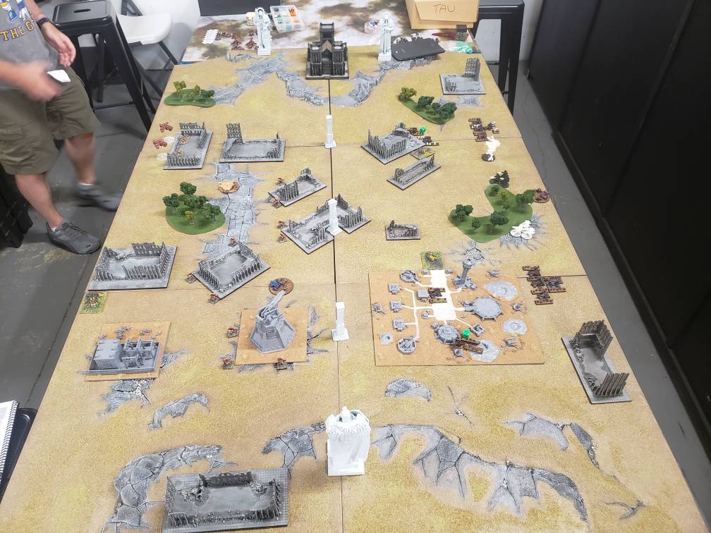 Tau were set up on the right of the table (see image.) Pathfinders were garrisoned forward, as were mattie's land speeders. Besides the dev bts, the rest of his army was off board, with the bikes in the thawks. I was lucky enough to win strategy and activated the Supremacy suit first, sustaining on a formation of land speeders, killing 2 but they remained unbroken. Next I retained and doubled my FW formation to fire on the damaged land speeders killing two more and breaking them.