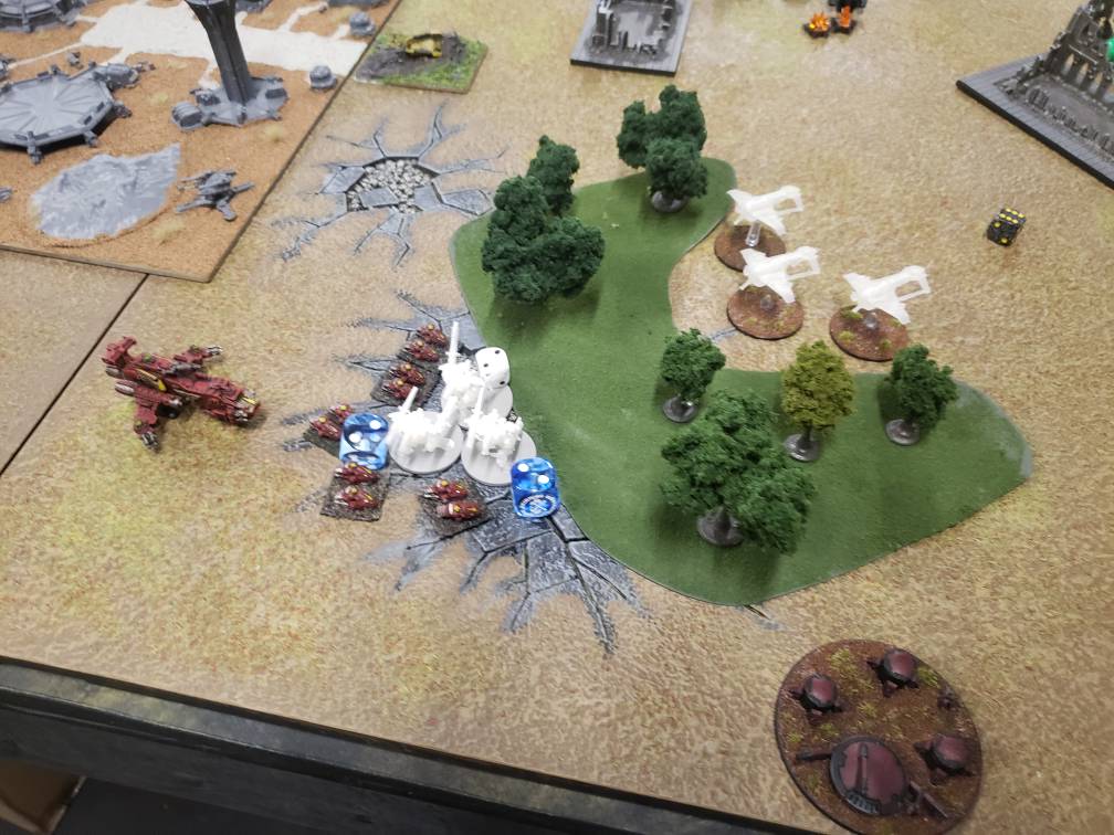 The game took a breather here as both sides started to manage activations. I set a formation of razorsharks on CAP. Mattie ground attacked the pathfinders with the talons to place a second blast marker. I set the second razorshark formation on CAP.