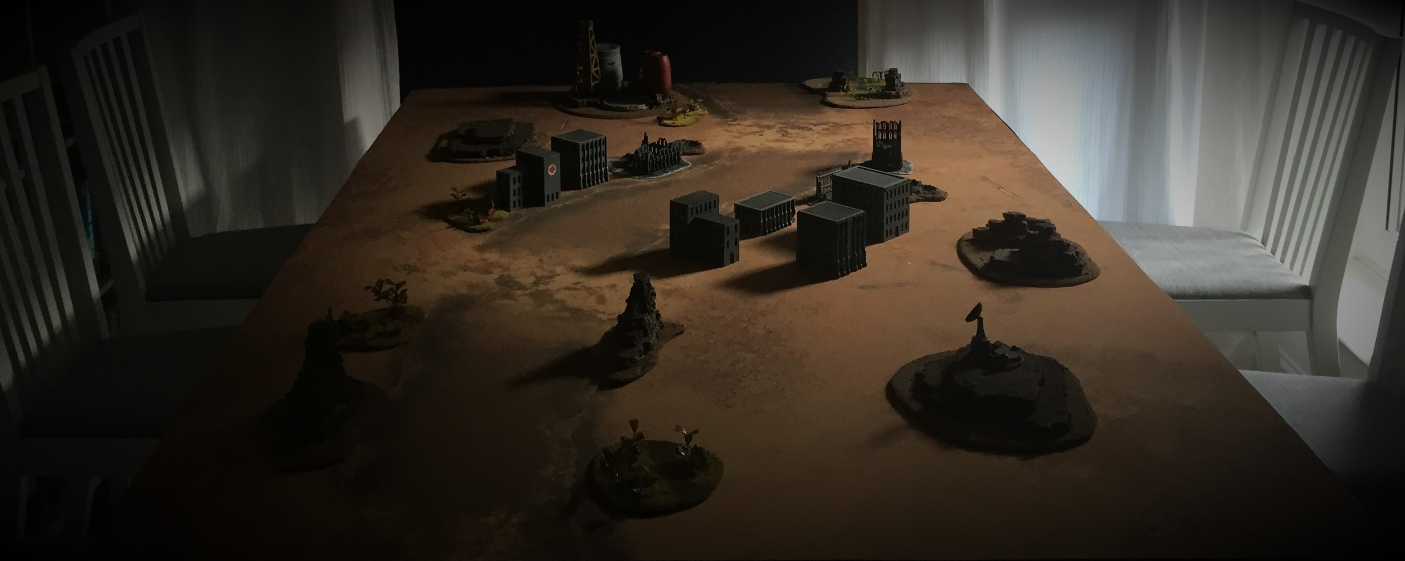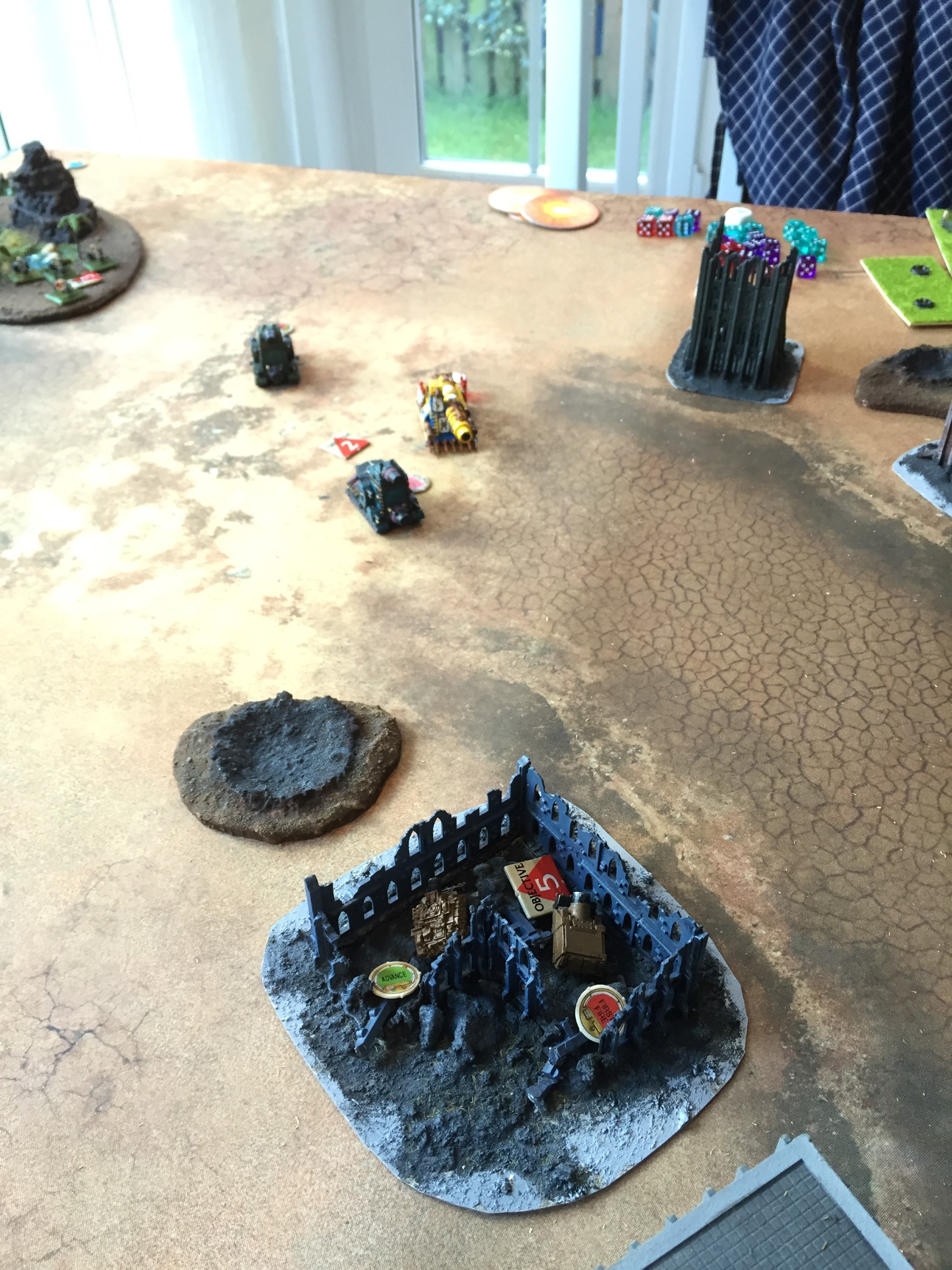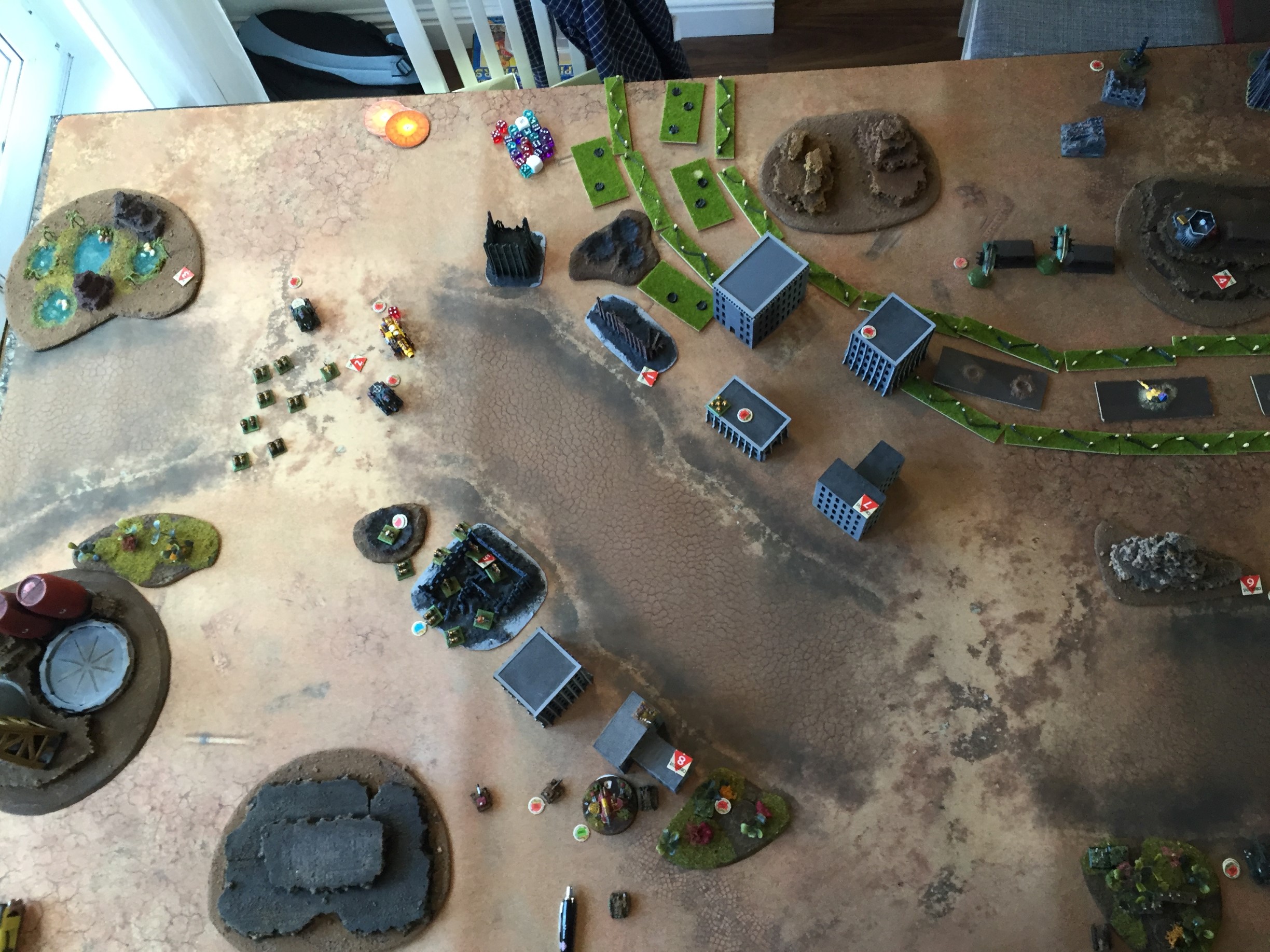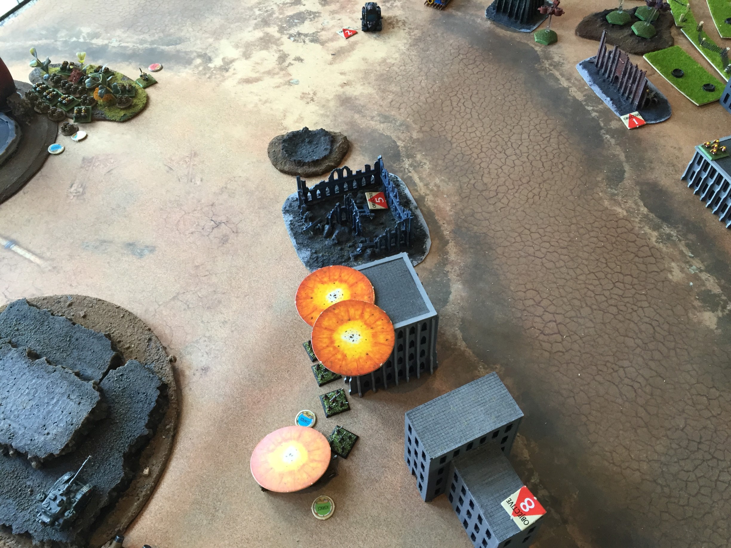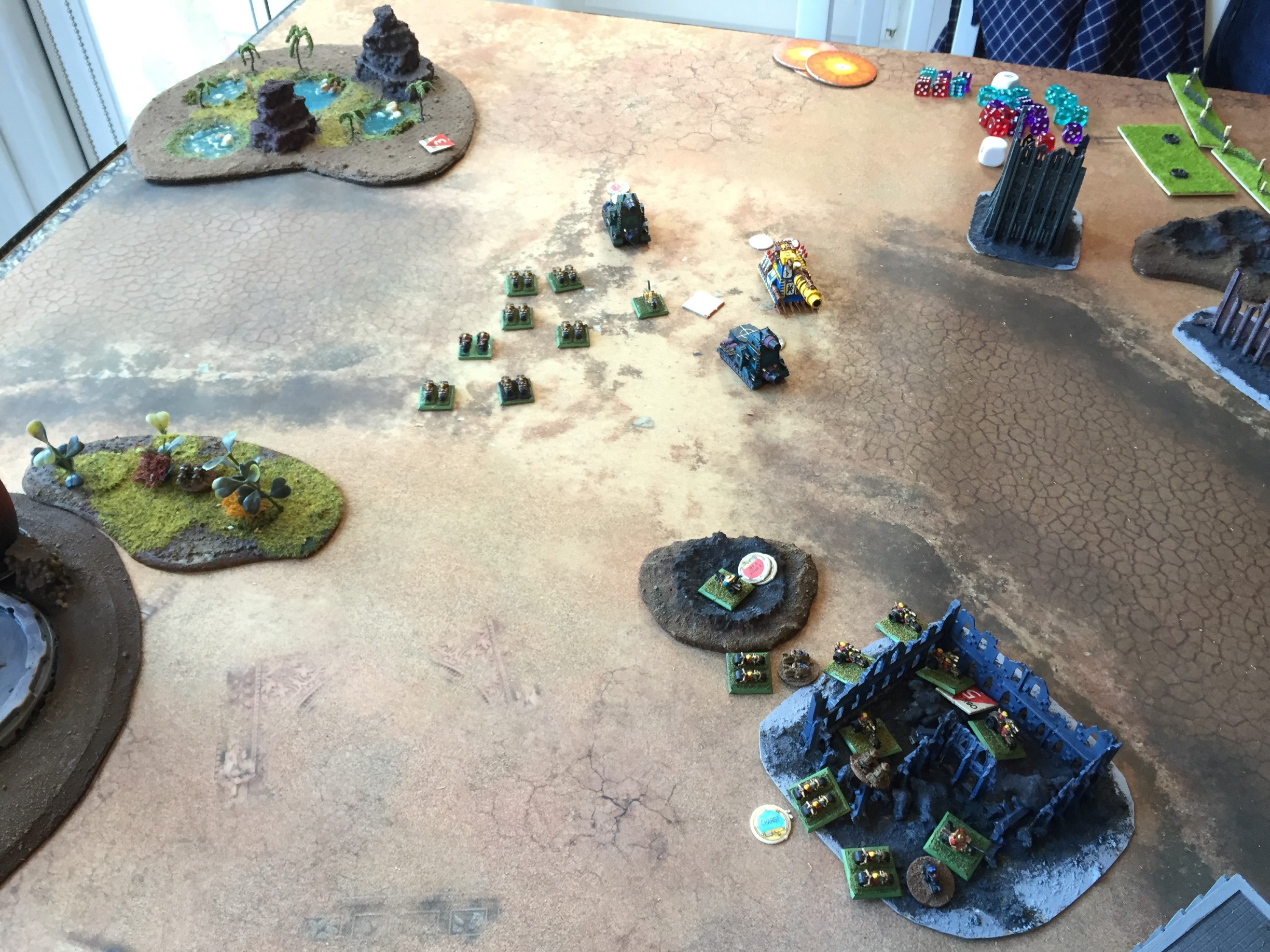 Imperial heavy troops spot the squat infantry moving in the buildings opposite them and fire from the tree line, eviscerating 3 units.
