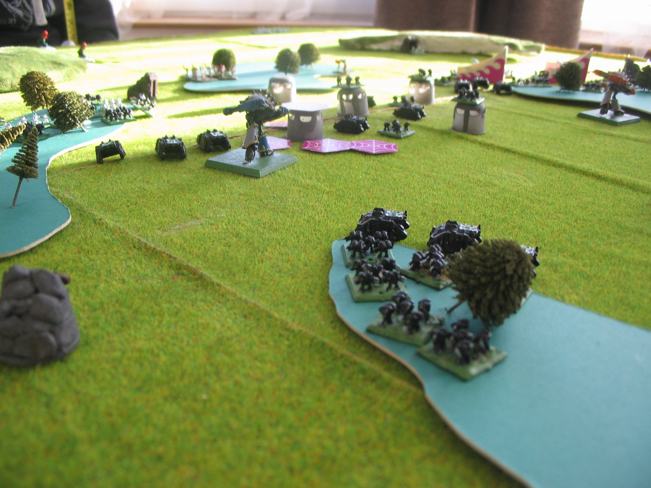 At the opposite end of the battlefield, the Eldar have a squad of Dire Avengers, Guardians and 2 squads of Grav Tanks (all part of the Warhost)>