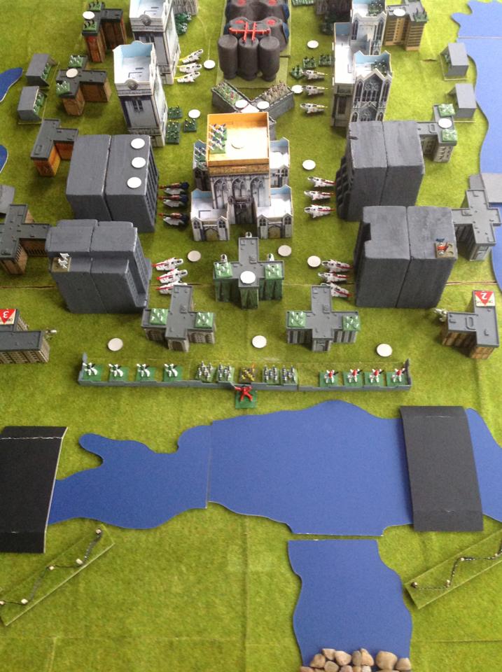Eldar, IG & Squats each spend 5k on forces. Eldar starts the game in the middle of the board in a town, IG and Sqauts set up at opposite corners of the board. There are three objectives to be captured. The Eldar player will win if he holds the central objective in the stronghold at the end of the game. The other players will win if they capture one objective and the central objective. VPs for breaking units are ignored.