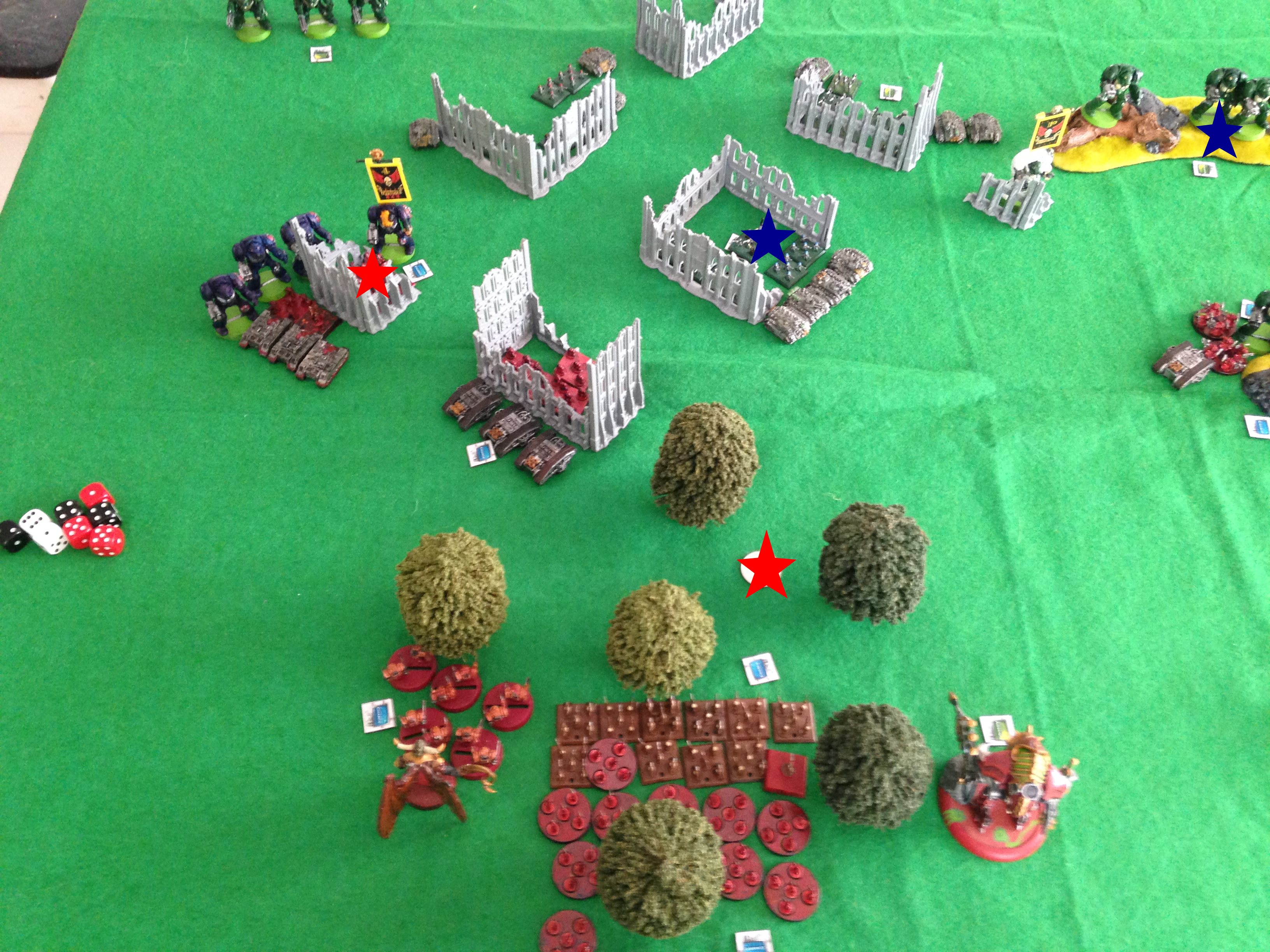 TURN 1 Knights won initative. Anticipating that the World Eaters would come knocking they chose not to attack to deeply onto the board rather waiting out the marines, and then counterattacking with a detachment of knights gaining the benefit of their lance attack. They tried the same ploy in the middle of the board, but were outmaneuvered by the more numerous Khorne units. Attachment: Attachment: End of movement The Basilisk opened up fire on the Lord of Battles (LoB), not even scratching it’s armour. The Baron followed suit, but with much greater success - forcing the LoB to draw on the powers of Chaos for the first time of the game. The Knights put some hurt into the World Eaters in the ruins and the Crusaders hit the LoB 6 times with a combination of Quake and Lascannon fire forcing Chaos to discard reward cards at an alarming rate. Angered, Khorne blessed his chosen and guided the fire of the predators on the Chaos right so that they felled 2 of the pesky Crusaders, watching gleefully as the last Crusader turned and ran from the field of blood. End of turn 1 Knights 15 Chaos 20 |