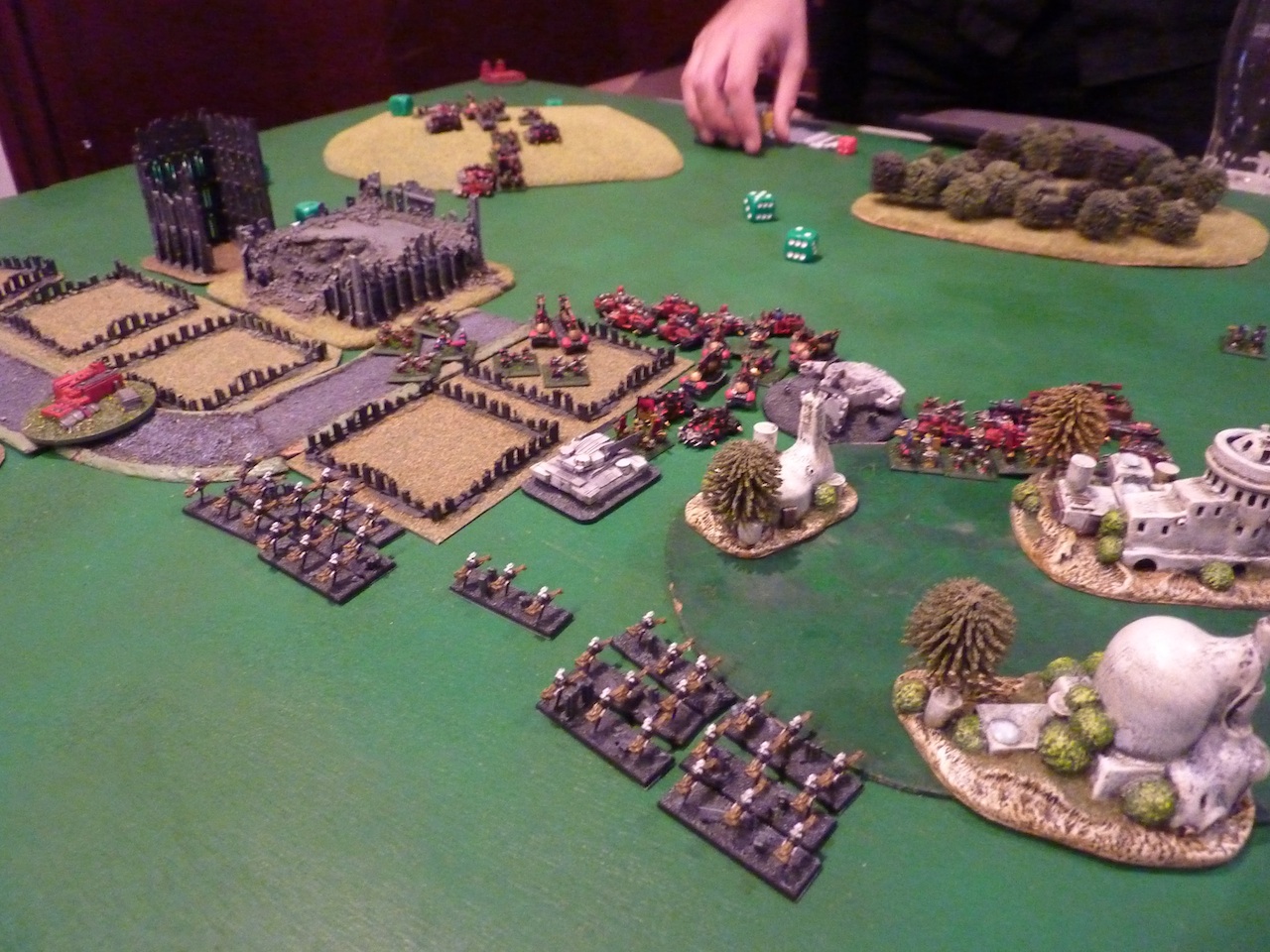 With the centre of the board filled with terrain, both sides advanced unimpeded. Florian's Warhound doubled into the ruins, breaking the warbikes before being broken in turn by three pips from Ork shooting. As the last action in the turn, my BTS(Big speed Freaks warband) attempted to assault Florian's baneblade, only to fail its activation roll(even with SC re-roll, sigh). The reason for its hesitancy soon became clear. Successfully assaulting next turn, it lost to the same Baneblade when it made all 8 RA saves!